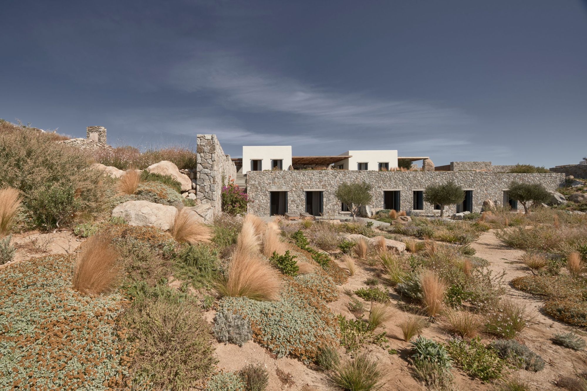 Κάτω από τον κήπο της πισίνας βρίσκονται οι κρεβατοκάμαρες, προσφέροντας ιδιωτικότητα, ενώ απολαμβάνουν ήσυχα την απρόσκοπτη θέα από τον κάτω κήπο προς τη θάλασσα.