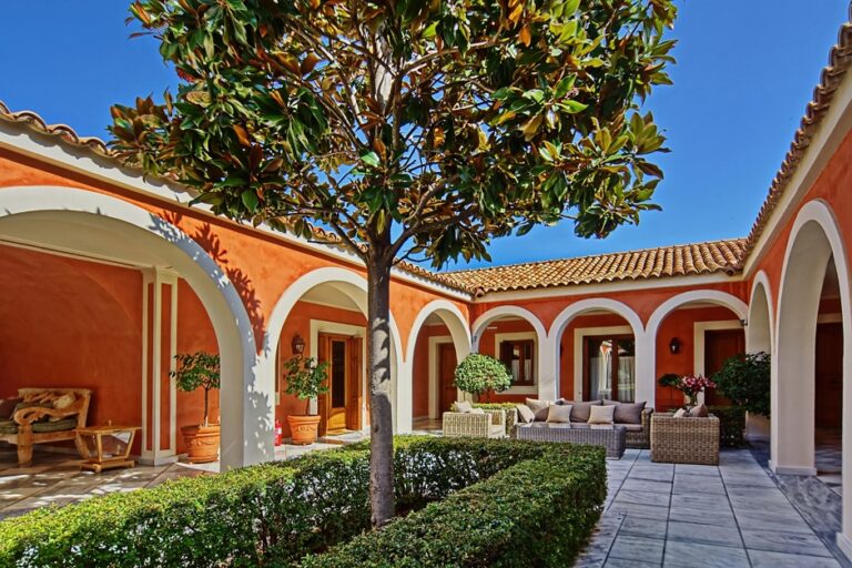 Περιβάλλεται από ένα τεράστιο καταπράσινο κήπο 2.000 τ.μ και προσφέρει πανοραμική θέα στο γαλάζιο του Ιονίου Πελάγους, στο Μεγανήσι και φυσικά στον Σκορπιό.