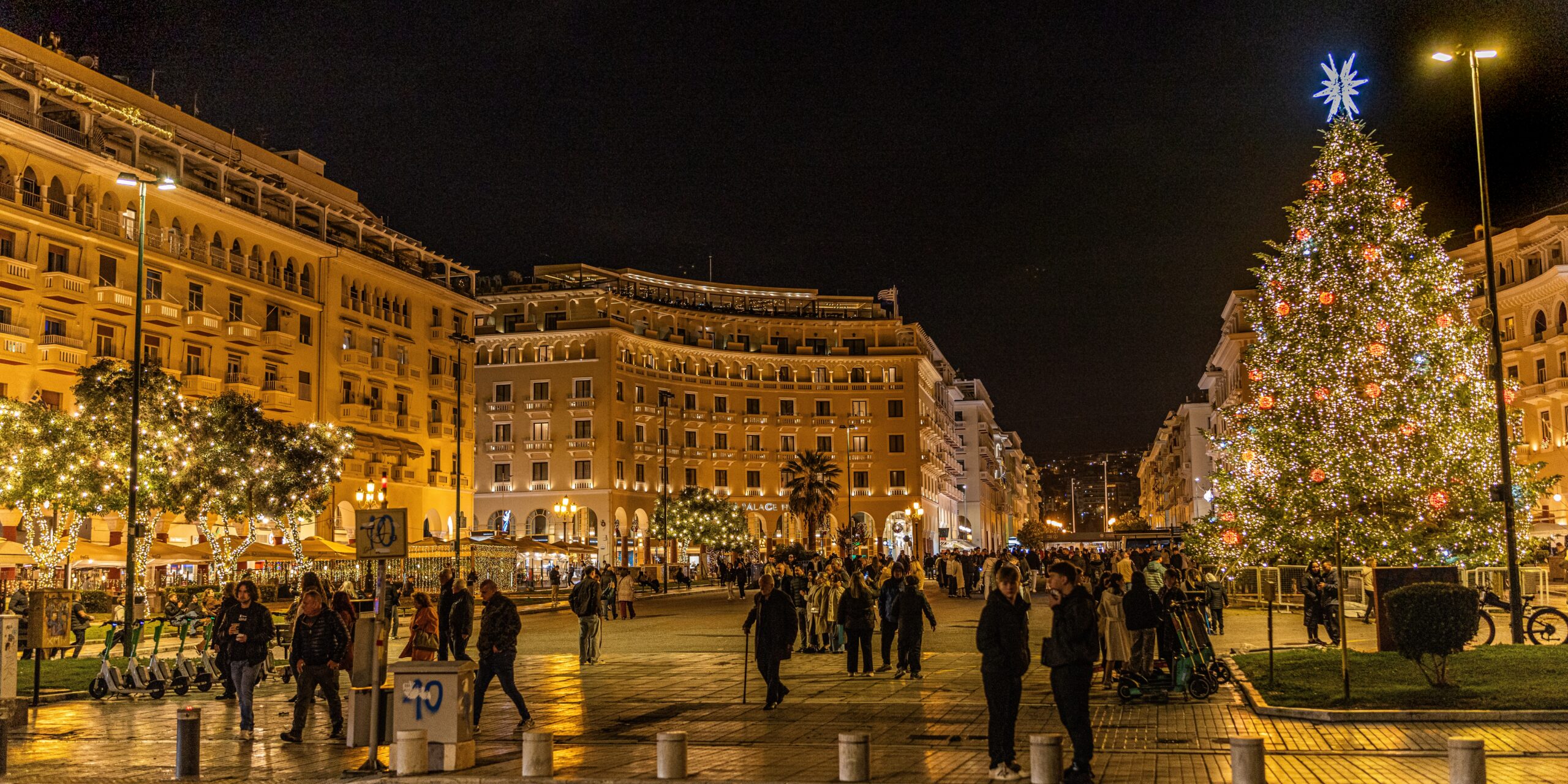 Στο κέντρο της γιορτής δεσπόζει η Πλατεία Αριστοτέλους, που κάθε Δεκέμβριο γίνεται το φωτεινό σημείο αναφοράς της πόλης. Το χριστουγεννιάτικο δέντρο, λαμπερό και επιβλητικό, πλαισιώνεται από στολισμένες στοές, φωτεινά μοτίβα και μια διαρκή κίνηση που κρατά την πλατεία ζωντανή από το πρωί έως αργά το βράδυ. Λίγο πιο πέρα, η Τσιμισκή και οι γύρω εμπορικοί δρόμοι ντύνονται με λαμπιόνια και γιορτινές βιτρίνες, δημιουργώντας ένα σκηνικό όπου η βόλτα μπλέκεται φυσικά με τις μικρές και μεγάλες αγορές των γιορτών.