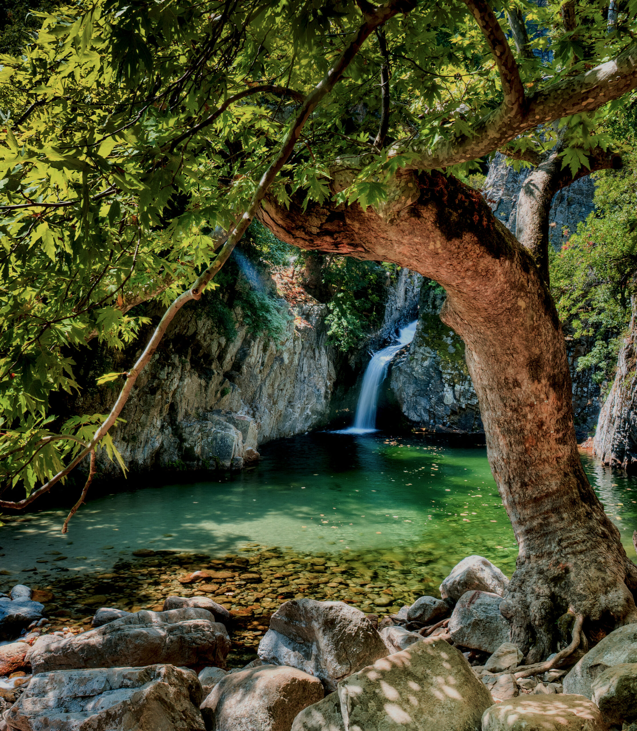 Η διαδρομή ξεκινά από το ποτάμι, ένα από τα πιο ειδυλλιακά σημεία του νησιού, και το μονοπάτι που οδηγεί στην πρώτη βάθρα μοιάζει σαν να έχει ξεπηδήσει από παραμύθι. Καθίστε να απολαύσετε το πρωινό σας ανάμεσα σε μεγάλους, λείους βράχους και καταρράκτες, με το νερό της φυσικής «πισίνας» να απλώνεται στα πόδια σας και το πράσινο του νησιού να σας αγκαλιάζει. Προμηθευτείτε, πριν ξεκινήσετε το μονοπάτι, άγρια μούρα, σύκα, παξιμάδι και χυμό πορτοκαλιού και απολαύστε αυτό το πλήρες γεύμα σε ένα από τα πιο μοναδικά τοπία της Ελλάδας.