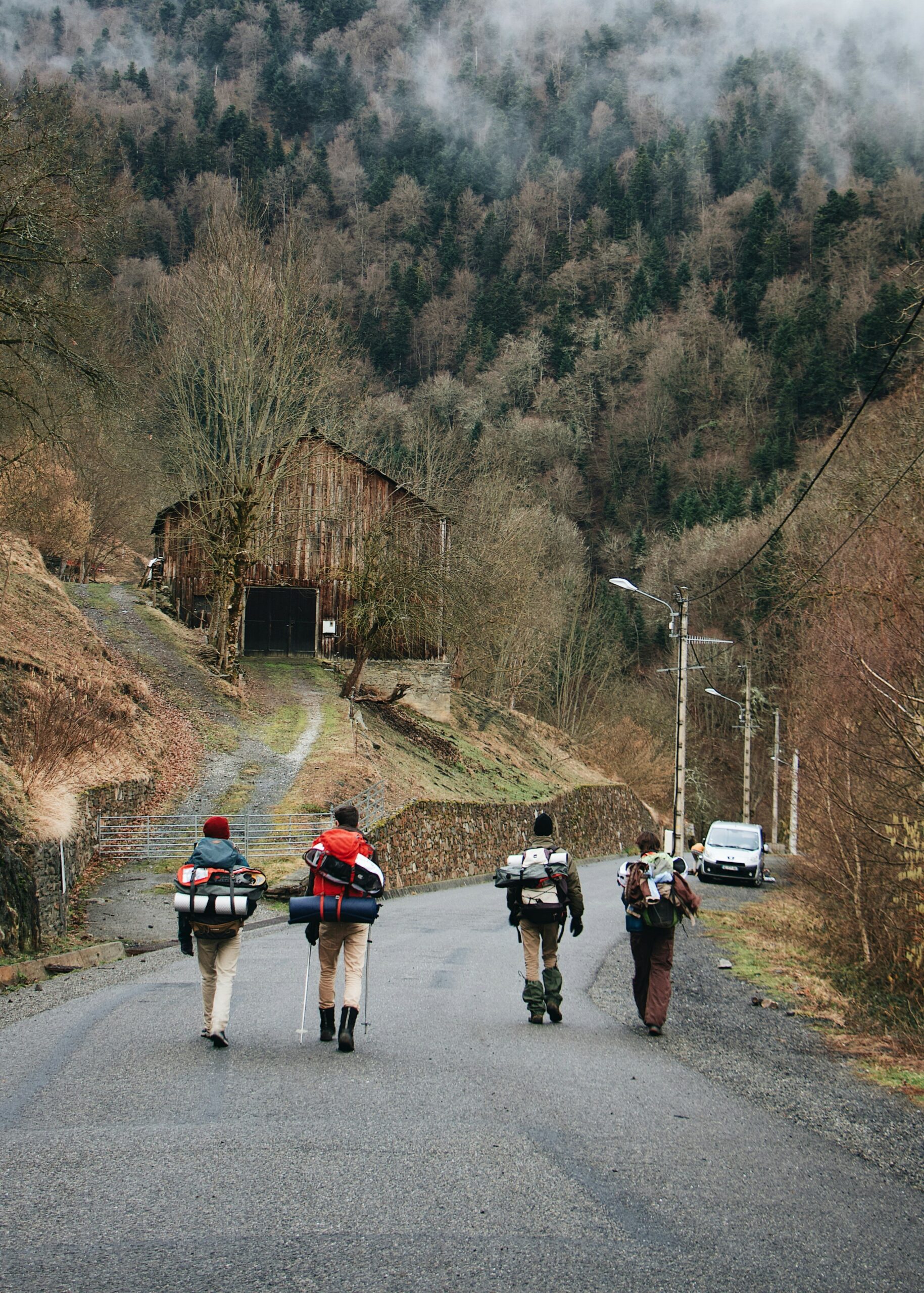 Ανοίγω το πορτάκι στο πίσω μέρος της κάμερας και τοποθετώ το πακέτο ταινιών instax mini. Το κλείνω και είμαστε έτοιμοι – το μόνο που χρειάζεται τώρα είναι καλοί φίλοι και περιπέτεια. Δένω σφιχτά τα κορδόνια στις μπότες μου, περνώ το λουράκι της κάμεράς μου γύρω από τον λαιμό, περιστρέφω τη ροδέλα για να επιλέξω το εφέ WT (Warm Tones) για ένα πιο ζεστό κάδρο και να το πρώτο κλικ. Καταγράφω τη στιγμή της αφετηρίας μας, φορτωμένοι όπως είμαστε με τα ογκώδη σακίδια. Όταν ο ήχος της ταινίας που εξάγεται σταματά, πιάνω την άκρη της και τη βγάζω. Ο μετρητής ταινιών μειώνεται με αριθμητική σειρά, αντίστροφα από το 10 με κάθε φωτογραφία που τραβιέται.