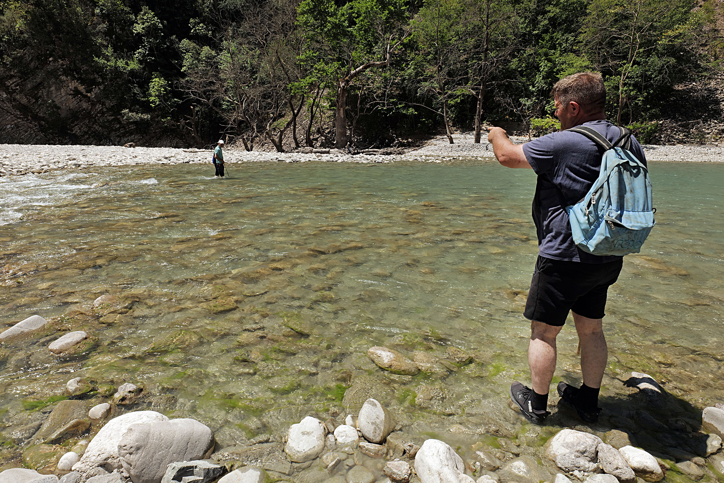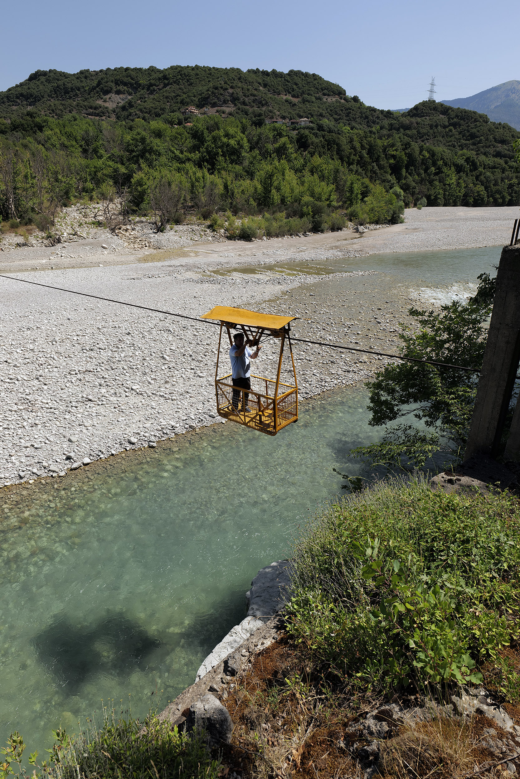 Έχοντας αφήσει την ασφάλεια και τη δροσιά του κλιματιστικού του Nissan X-Trail κοντά στην κοίτη του Αχελώου, ακολουθώ τον Παναγιώτη Κοσσυβάκη στη διαδρομή μέχρι την «περαταριά», το χειροκίνητο τελεφερίκ στο χωριό Πέρδικα, κοντά στον Μεσόπυργο Άρτας. Το λιγοστό, συγκριτικά, νερό του ποταμού τον Ιούλιο, αποκαλύπτει τα λευκά βότσαλα του άλλοτε βυθού, αντανακλώντας μια απίστευτη αντηλιά αλλά και ζέστη από τη δύναμη του ήλιου.