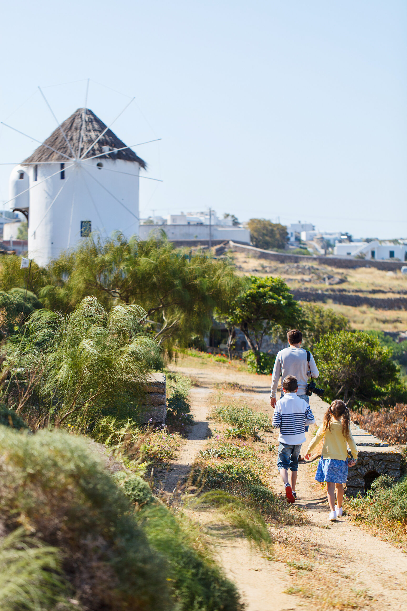 Κοντά στη Χώρα, η διαδρομή γύρω από τους ανεμόμυλους προσφέρει έναν εύκολο, σύντομο και απολαυστικό περίπατο. Ξεκινά από το λιμάνι και ανηφορίζει προς τους εμβληματικούς ανεμόμυλους του νησιού, συνεχίζοντας περιμετρικά ως τη διάσημη «Μικρή Βενετία» και καταλήγοντας ξανά στα σοκάκια της Χώρας. Είναι μια εμπειρία ιδανική για το ηλιοβασίλεμα, όταν το φως βάφει τα δρομάκια με αποχρώσεις χρυσού και κεχριμπαριού, δημιουργώντας εικόνες που μένουν χαραγμένες στη μνήμη.