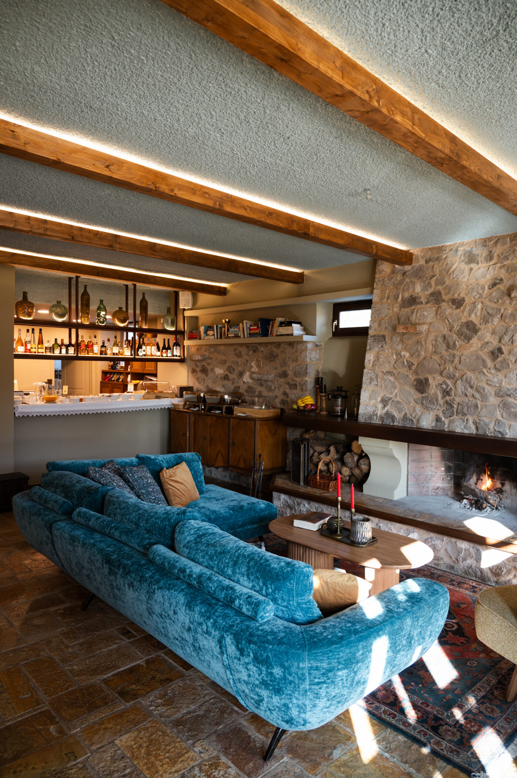 Ο μπλε καναπές του χώρου υποδοχής δημιουργεί την κατάλληλη φωλιά για τις παρέες τα βράδια, εκεί που οι ιστορίες ξεδιπλώνονται μπροστά στο τζάκι που σιγοκαίει ολονυχτίς. Τα δωμάτια προσεκτικά φροντισμένα, με ονόματα λουλουδιών, σαν μία νοερή ανθοδέσμη, αδημονούν να μας αγκαλιάσουν. Το δικό μας: η Ανεμώνη. Με το πρώτο βήμα, κατευθύνομαι στη μπαλκονόπορτα, και το καθόλα γραφικό μπαλκόνι μας, που ανοίγει στην αυλή και προσφέρει θέα έως τη βουνοπλαγιά. Βαθιά ανάσα και επιστρέφω στο εσωτερικό του δωματίου, όπου δεν με κρατά πολύ, καθώς είμαι έτοιμη για εξερεύνηση.
