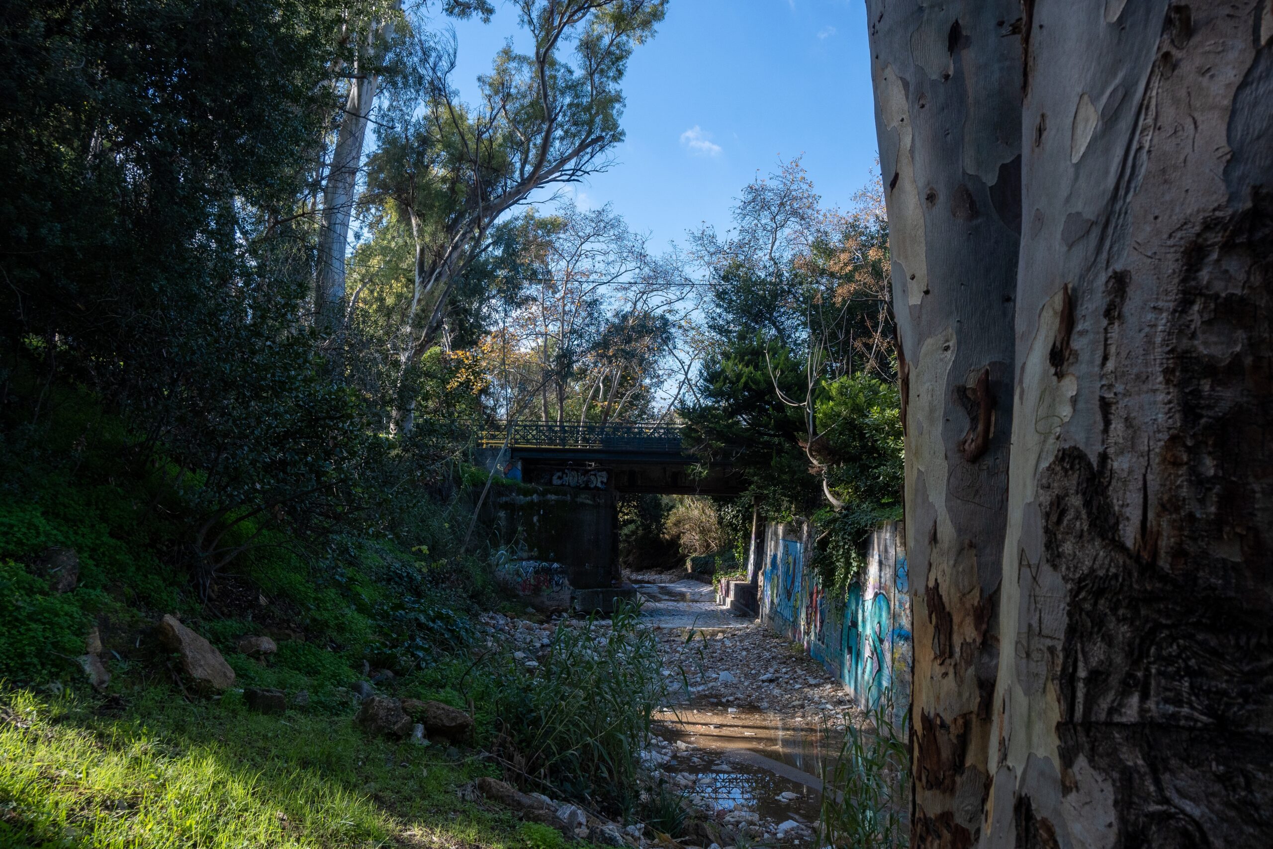 Τελευταία στάση για το project μας ήταν η Ρεματιά στο Χαλάνδρι. Αυτή τη φορά το πρόγραμμα εμπλουτίστηκε και με πεζοπορία στο μονοπάτι της. Δεν είχαμε ξαναπάει σε αυτό το μαγικό μέρος και πραγματικά δεν μπορούσαμε να πιστέψουμε ότι στο Χαλάνδρι που γνωρίζουμε υπάρχει αυτή η όαση με τα πεύκα. Ξεκινήσαμε από την εκκλησία του Αγίου Αθανασίου στην οδό Ευρίπου και αμέσως μπήκαμε στο κατάφυτο μονοπάτι που ακολουθεί την κοίτη του ρέματος, περνώντας ανάμεσα σε πεύκα, κυπαρίσσια, ευκαλύπτους, ελιές και αμυγδαλιές, έναν πραγματικό πνεύμονα πρασίνου μέσα στο αστικό τοπίο. Στην οδό Νυμφών βρήκαμε σκάλες που μας οδήγησαν σε μια μεταλλική πεζογέφυρα πάνω από το ρέμα. Η θέα από εκεί ήταν μαγική. Το πράσινο απλωνόταν μπροστά μας, το φως έπεφτε απαλά μέσα από τα κλαδιά των δέντρων και ακούγαμε το γλυκό θρόισμα των φύλλων.