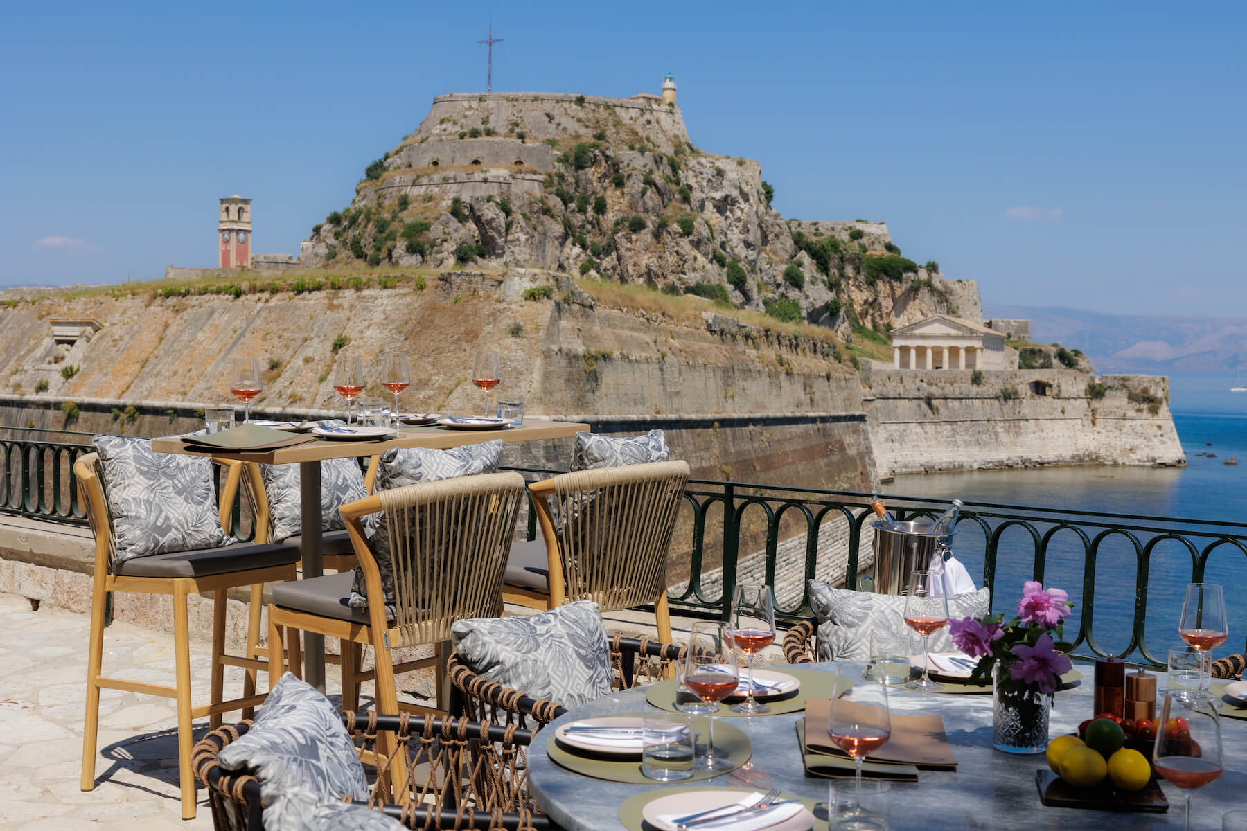 Υπάρχουν κάποια μέρη που μοιάζουν σαν να υπήρχαν εκεί από πάντα, ακριβώς στο ίδιο σημείο όπου τα αντικρίζουμε και σήμερα, λες και γεννήθηκαν από το ίδιο το μαγευτικό τοπίο που τα περιβάλλει. Σε ένα από τα ωραιότερα σημεία της Κέρκυρας, το εστιατόριο Ora, με θέα στο εμβληματικό Φρούριο της Κέρκυρας, μοιάζει λες και είναι χτισμένο πάνω στο νερό, προσκαλώντας τον επισκέπτη σε μία από τις πιο ειδυλλιακές τοποθεσίες ολόκληρου του νησιού και, την ίδια στιγμή, σε ένα από τα πλέον χαρακτηριστικά σημεία όλου του Ιονίου.
