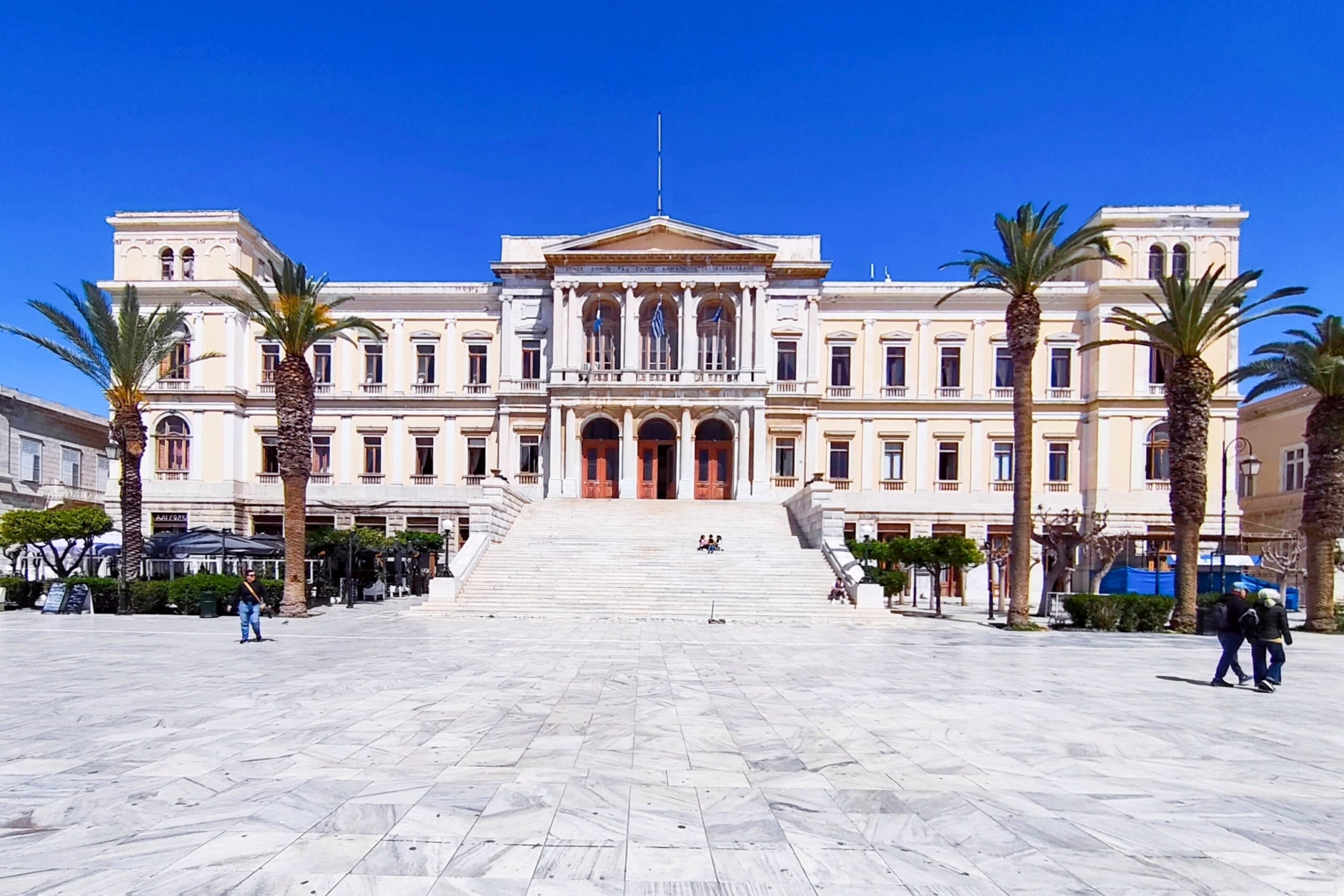 Κάνοντας τη βόλτα σας στο ιστορικό κέντρο, θα καταλήξετε αναπόφευκτα στην πλατεία Μιαούλη, την καρδιά της πόλης. Εκεί δεσπόζει το Δημαρχείο, ένα αρχιτεκτονικό αριστούργημα του 1889, έργο του Ερνστ Τσίλλερ. Πρόκειται για ένα από τα μεγαλύτερα δημαρχεία της Ελλάδας, με εντυπωσιακούς εσωτερικούς χώρους, trompe l’oeil τοιχογραφίες, γλυπτά και έργα τοπικών καλλιτεχνών. Στο εσωτερικό του στεγάζεται το Αρχαιολογικό Μουσείο της Σύρου, καθώς και μια παλαιά άμαξα που σύμφωνα με την παράδοση είχε συνδεθεί με την αυτοκράτειρα Ελισάβετ της Αυστροουγγαρίας (Σίσσυ).