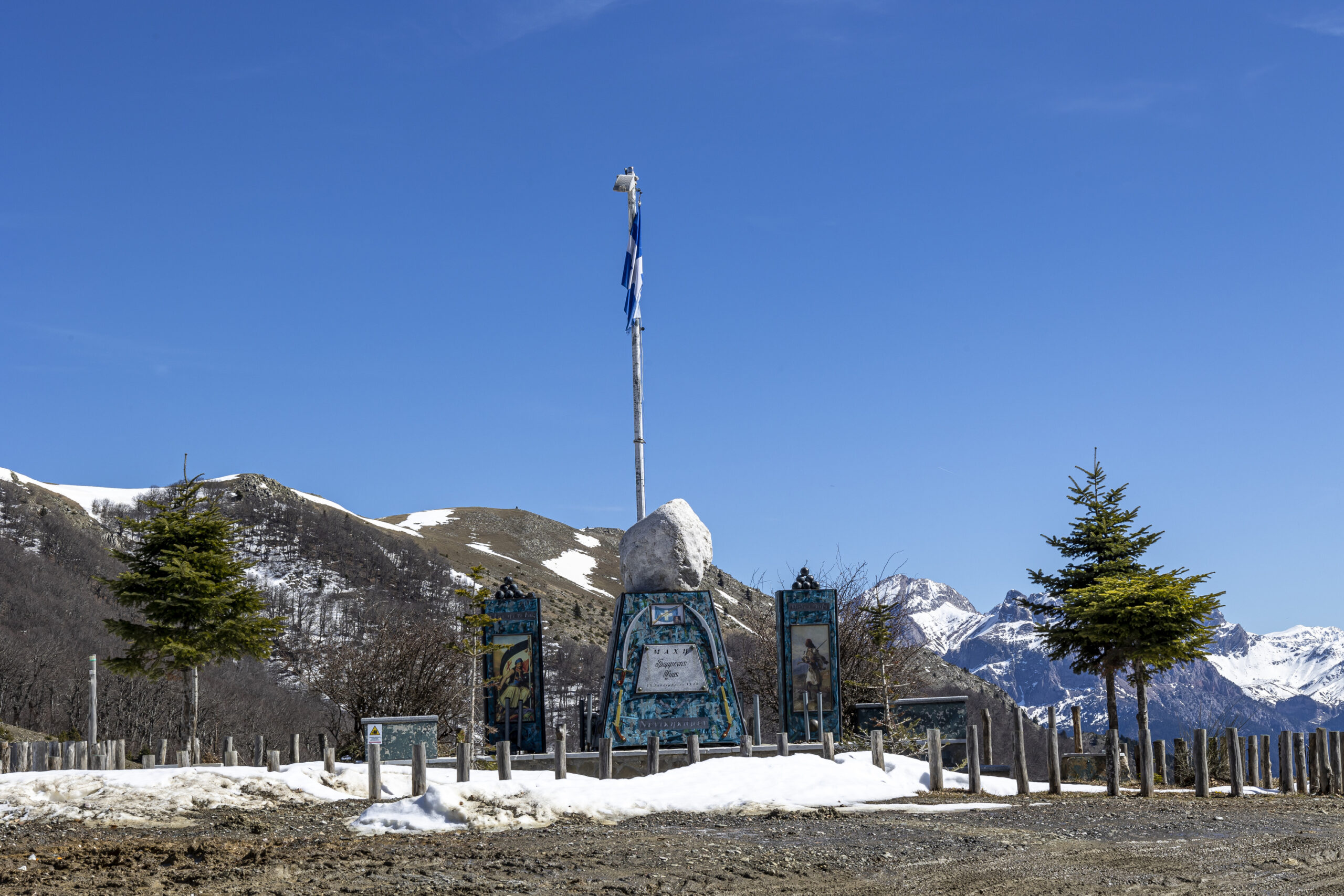 Ο βροχερός καιρός και οι χαμηλές θερμοκρασίες μάς συντροφεύουν σε όλο το μήκος της διαδρομής από την Μακρακώμη προς τις Ράχες Τυμφρηστού, ενώ λίγο πριν τον αυχένα αρχίζει και μια ελαφριά χιονόπτωση. Στο «διάσελο» όπως λένε οι ντόπιοι αυτό που οι Ευρωπαίοι ονομάζουν «πάσα» (sic) κάνουμε αριστερά προς Κρίκελλο, Δομνίστα, Άμπλιανη και Στάβλους. Λίγα χιλιόμετρα πιο κάτω, σε ένα δρόμο που είναι η χαρά του petrolhead, βρίσκουμε αριστερά μας μια μικρή πινακίδα που μας οδηγεί στα Κοκκάλια. Λασπωμένος χωματόδρομος με αρκετά «φαγώματα». Ακολουθούμε κατά γράμμα το μονοπάτι του χάρτη που δεν είναι τίποτε άλλο από ροδιές κάποιων 4×4 οχημάτων που σκαρφαλώνουν κατά καιρούς την ομαλή ράχη. Μετά από 10-15 λεπτά οδήγησης φτάνουμε στο σημείο όπου υπάρχει το ομώνυμο μνημείο.