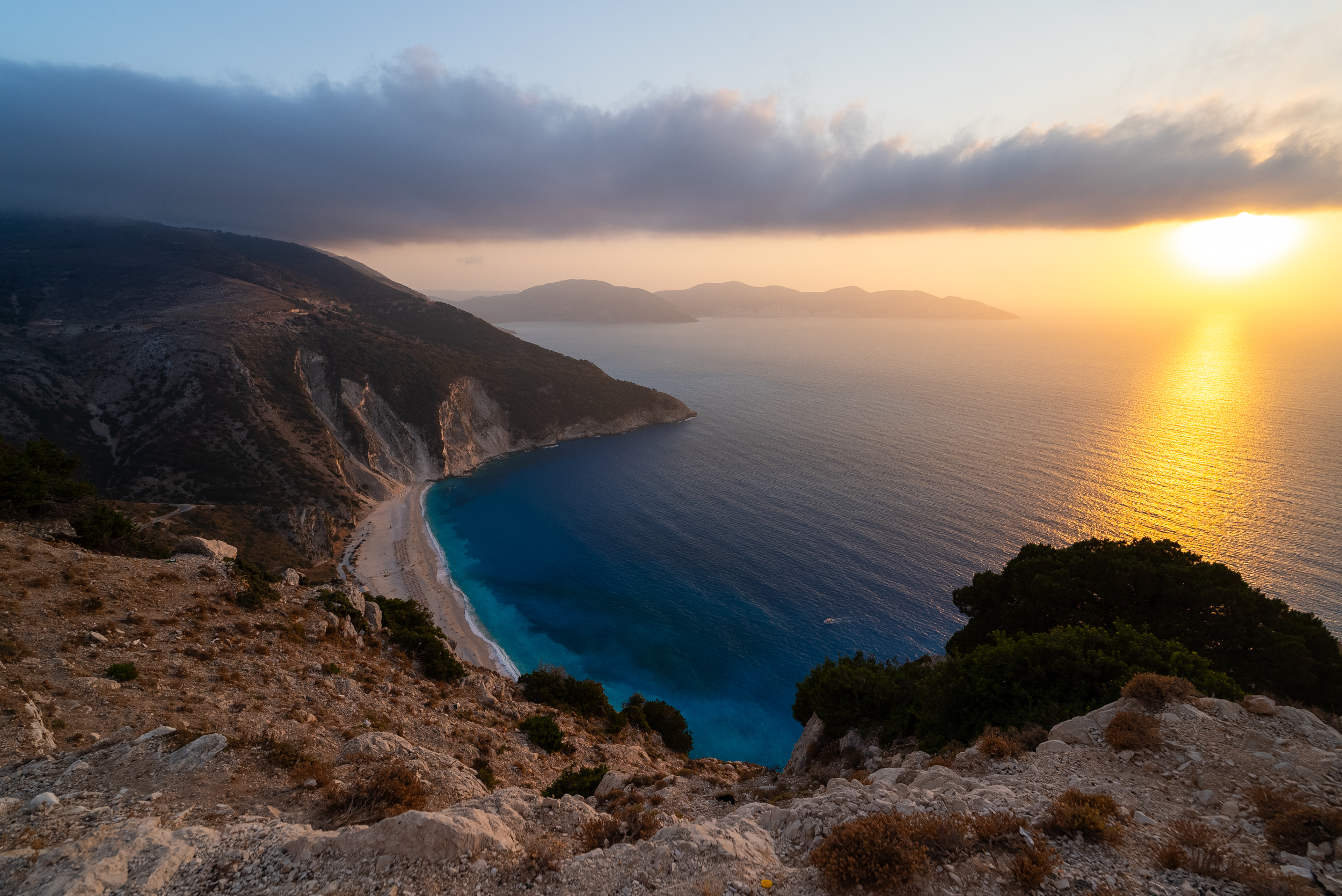 Ήταν συνώνυμο απόλυτης ηρεμίας η θέα του απέραντου γαλάζιου της θάλασσας σε ισόρροπη αντίθεση με το λευκό βότσαλο της ακτής και τα άναρχα σμιλεμένα γκριζωπά βράχια. Χορτασμένοι από την ομορφιά αυτού του τοπίου, πήραμε το δρόμο της επιστροφής προς το Ληξούρι. Ακολούθησε μια σύντομη βόλτα στη δεύτερη μεγαλύτερη πόλη του νησιού που διατηρεί ατόφια τη γραφικότητα της. Καθώς ο ήλιος έδυε επιβιβαστήκαμε στο ferry boat από το Ληξούρι για το Αργοστόλι, απολαμβάνοντας εν πλω τους ποικίλους χρωματικούς τόνους στον ορίζοντα.