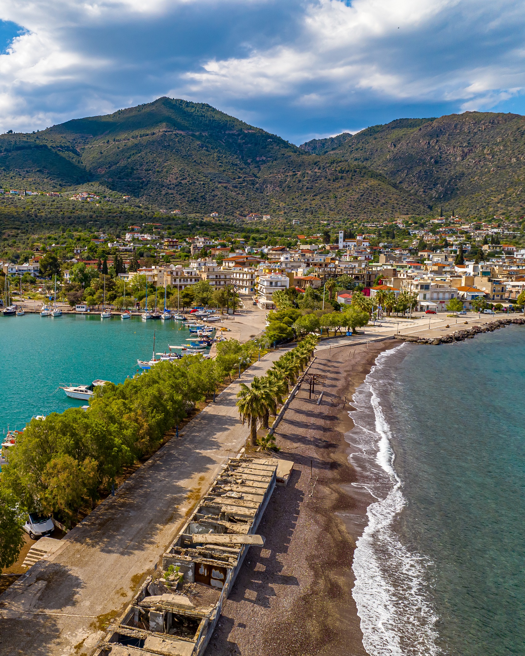 Μόλις αποβιβαστείτε στο λιμάνι θα βρεθείτε σε μια περιοχή γεμάτη με καφέ και ταβέρνες. Όμως αυτό που θα τραβήξει άμεσα το βλέμμα σας είναι η διάσημη Λουτρόπολη, η οποία αντανακλά τη φήμη των ιαματικών, γεωθερμικών πηγών των Μεθάνων, που κρατάει ήδη από το 1870, όταν οργανώθηκε το πρώτο υδροθεραπευτήριο. Ξεκινώντας τώρα να οδηγείτε από εκεί, θα αφήσετε πίσω σας το λιμάνι και θα κινηθείτε προς τα νότια, συναντώντας το Κάστρο του Φαβιέρου, ένα παράδειγμα για τη συνύπαρξη ανθρώπου και άγριας φύσης. Εδώ, ο ομώνυμος Γάλλος στρατηγός οργάνωσε τον πρώτο τακτικό στρατό της νεότερης Ελλάδας.