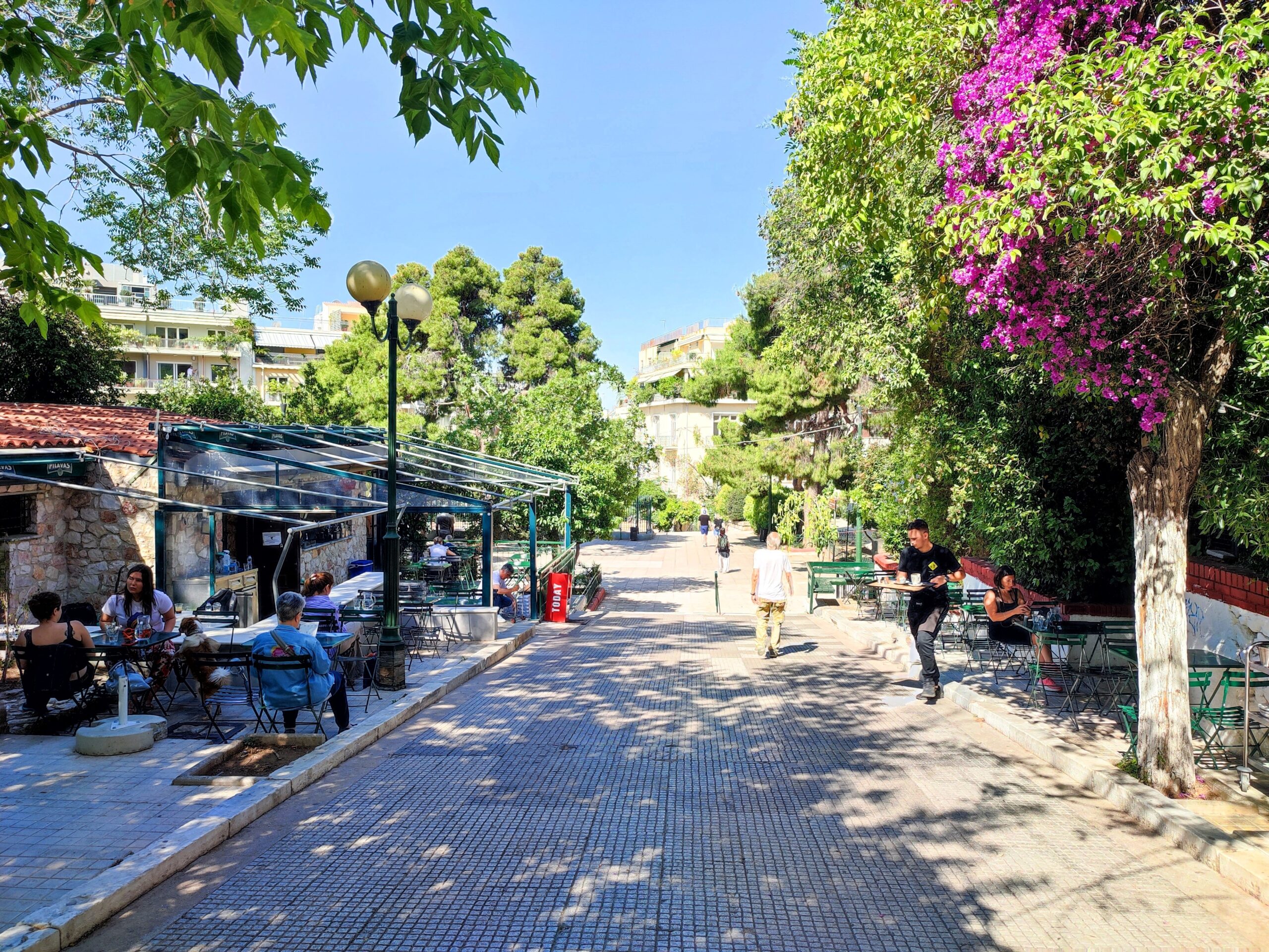 Κάπου εκεί αποφασίζουμε να κάνουμε μία στάση για έναν καφέ στο χέρι, και ένα μικρό καφέ με πανοραμική θέα δεν μας απογοητεύει. Ένα πραγματικά εμβληματικό σημείο της πόλης, με θέα που κόβει την ανάσα, στέκει ακόμα εκεί με το χαρακτηριστικό του μπαλκονάκι, ταξιδεύοντάς μας σε χρόνους που προηγήθηκαν της δικής μας γενιάς. Καθίσαμε σε ένα πεζούλι, πέντε βήματα πιο πέρα, και χαζέψαμε την εικόνα της Αθήνας που απλωνόταν μέχρι εκεί που έφτανε το βλέμμα μας. Ήπιαμε λίγο καφέ κοιτάζοντας απέναντι και συζητήσαμε την πορεία που θα ακολουθούσαμε στη συνέχεια της ημέρας. Ο ήλιος είχε ανέβει ήδη ψηλά στον ουρανό, το μεσημέρι πλησίαζε, και η πείνα άρχισε να κάνει έντονη την εμφάνισή της.