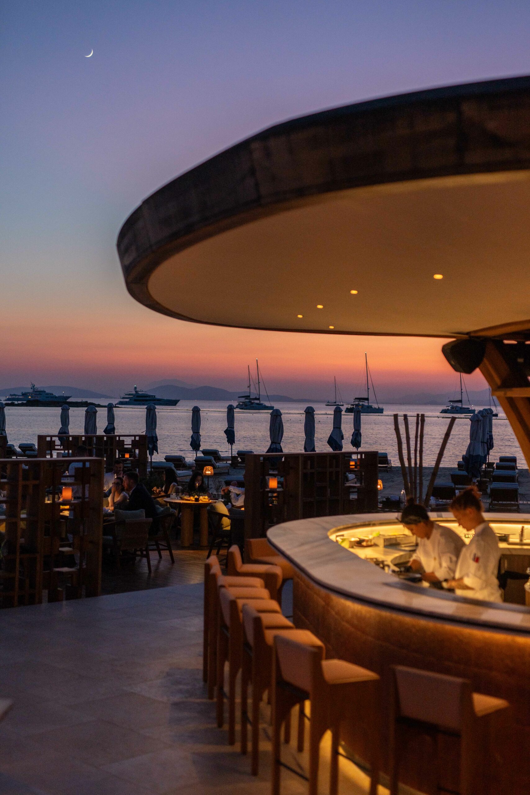 Το Sumosan έχει μεταμορφώσει τον χώρο του Thimisi Bar σε έναν προορισμό που συνδυάζει την ιαπωνική αισθητική με τη μεσογειακή ζεστασιά. Τα τραπέζια είναι στρατηγικά τοποθετημένα, προσφέροντας μαγευτική θέα στη θάλασσα, ενώ ο σχεδιασμός, με στοιχεία φυσικού ξύλου και καθαρές γραμμές, δημιουργεί μια ατμόσφαιρα χαλαρότητας που αναζωογονεί τις αισθήσεις. Καθώς κάθομαι στο τραπέζι μου, παρατηρώ τους σεφ να δουλεύουν με «χειρουργική» ακρίβεια πίσω από το open sushi bar. Κάθε τους κίνηση, μέρος μιας «χορογραφίας» τέχνης και δεξιοτεχνίας.