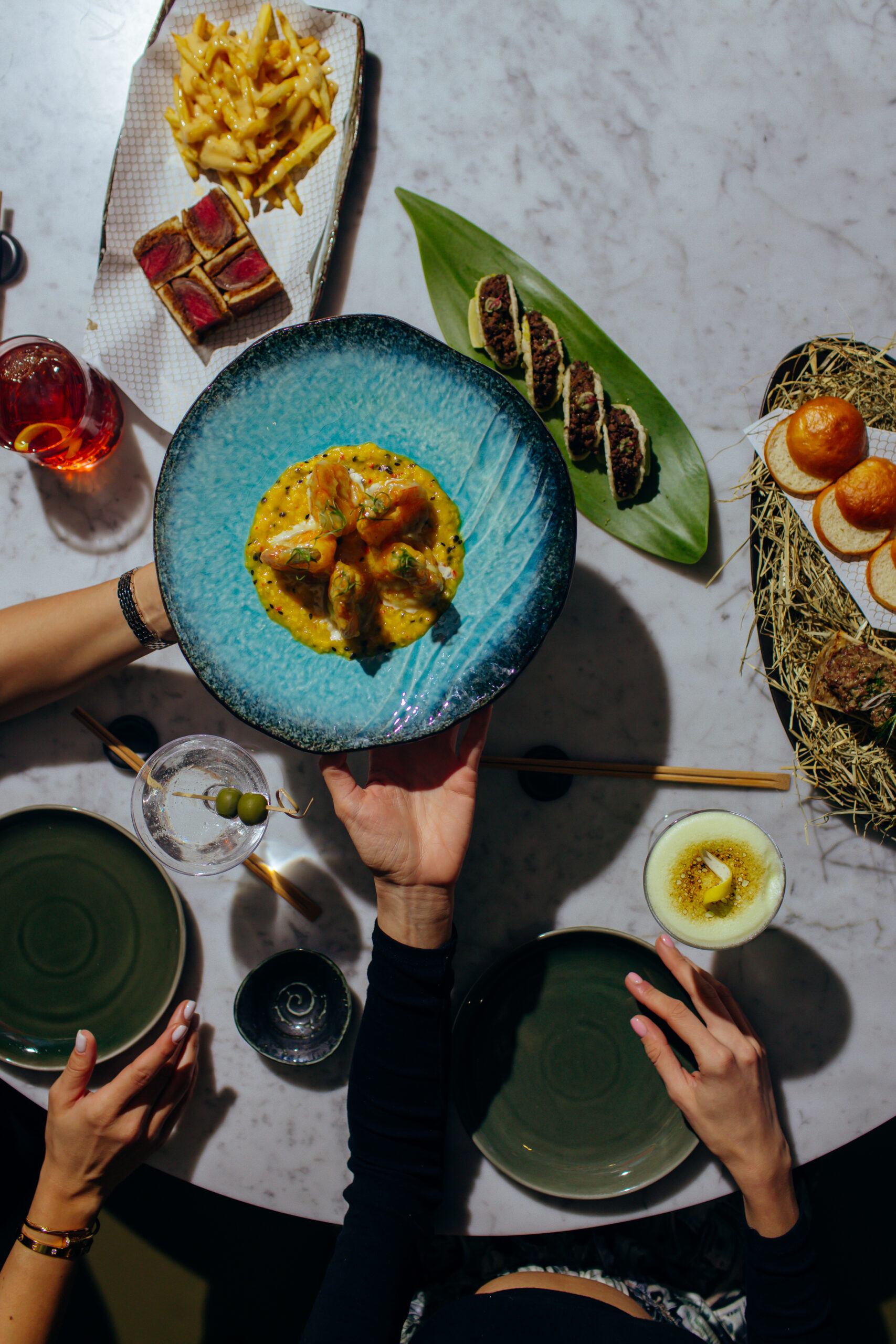 Αυτό που με εντυπωσιάζει αμέσως είναι η ποιότητα των υλικών. Τα sashimi είναι τόσο φρέσκα, που σχεδόν λαμπυρίζουν, ενώ κάθε πιάτο καταφτάνει σαν ένα μικρό έργο τέχνης στο τραπέζι μας. Η σαλάτα αστακού, μια από τις signature δημιουργίες, αποτελεί έναν εκρηκτικό συνδυασμό φρεσκάδας και ιαπωνικών επιρροών. Τα sashimi taquitos δίνουν μια παιχνιδιάρικη πινελιά στην παραδοσιακή ιαπωνική κουζίνα, ενώ ο μαύρος μπακαλιάρος με miso αποδεικνύεται αληθινή γαστρονομική αποκάλυψη.