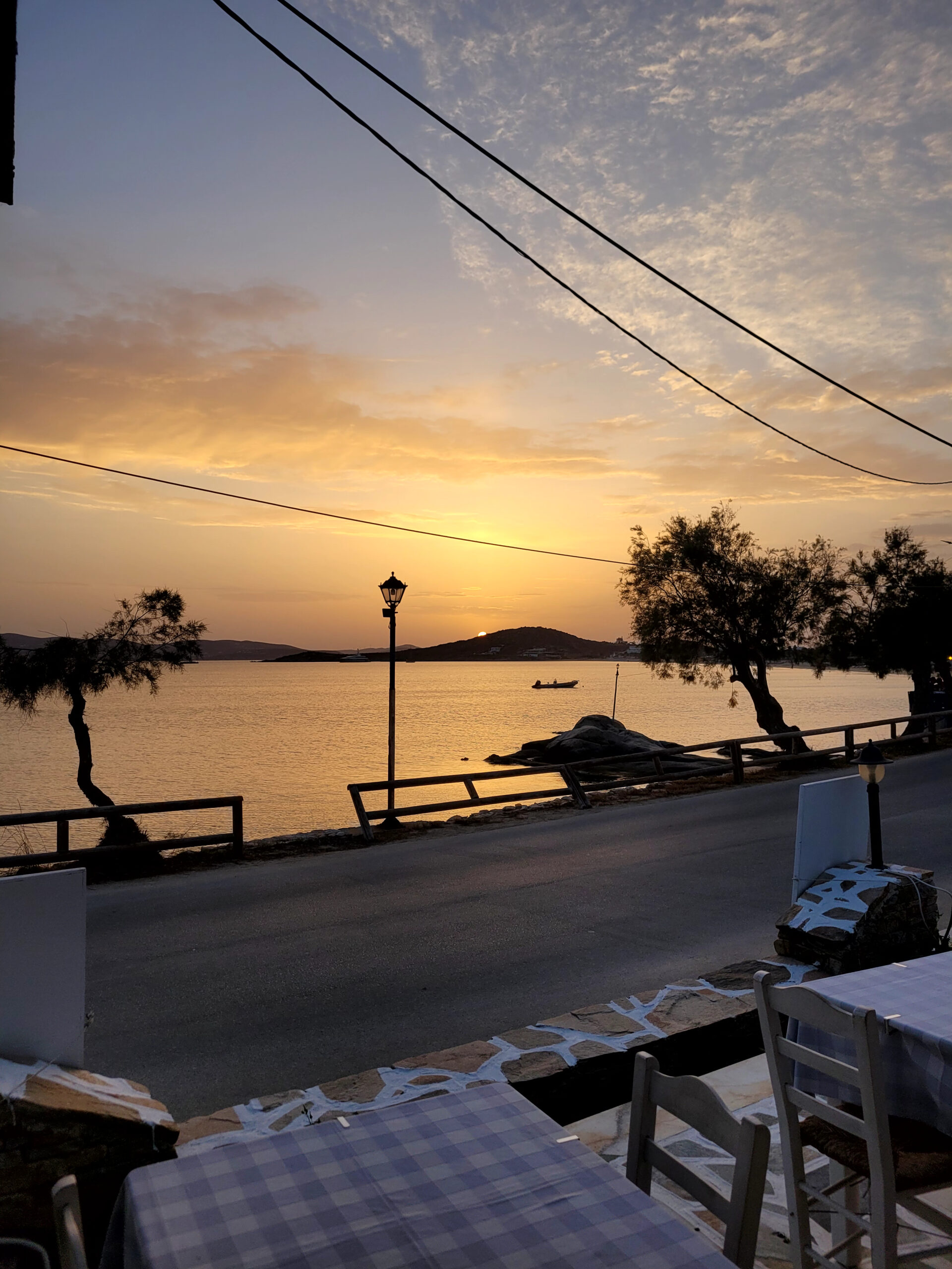 Ο τρόπος με τον οποία η λιτή, νησιώτικη ταυτότητα του Sunset μπλέκεται αβίαστα με την ομορφιά του φυσικού τοπίου είναι μοναδικός. Την ώρα του ηλιοβασιλέματος, όταν ο ήλιος πέφτει μέσα στη θάλασσα βάφοντας τα νερά της από μπλε πορτοκαλοκόκκινα, η γραφική, πλακόστρωτη βεράντα του εστιατορίου μοιάζει να γίνεται η φυσική, αναμενόμενη προέκταση της ωραίας παραλίας.