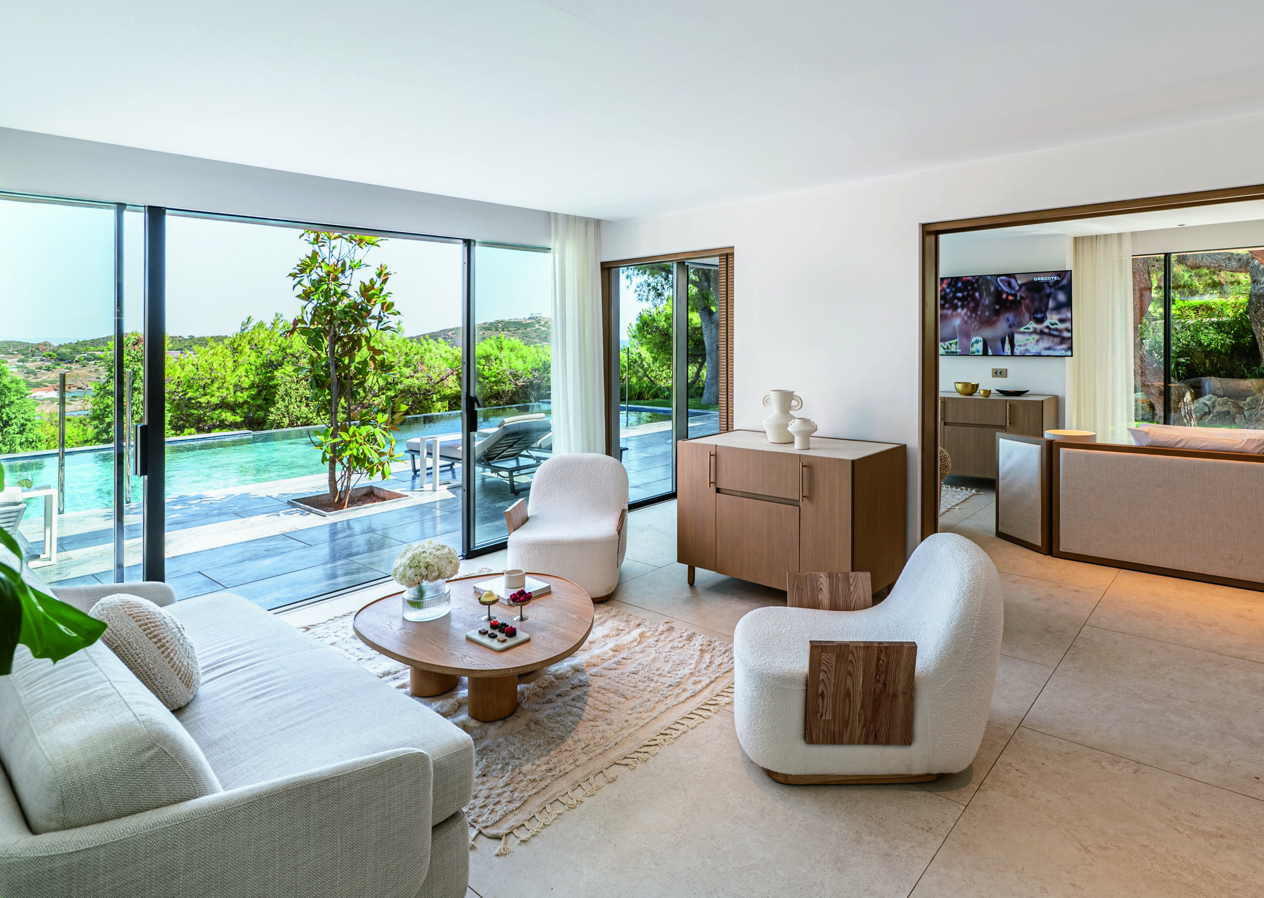 Εδώ η διαμονή γίνεται αναπόσπαστο κομμάτι της εμπειρίας. Το resort, με κήπους γεμάτους φοίνικες και ελαιώνες, με μονοπάτια που οδηγούν στις πισίνες ή στη θάλασσα, αποπνέει αίσθηση ήσυχης πολυτέλειας. Οι κατοικίες του Cape Sounio, είτε πρόκειται για οικογενειακά δωμάτια είτε για παραθαλάσσιες μεζονέτες, είναι διάσπαρτες μέσα στην αγκαλιά ενός προστατευμένου πευκοδάσους, προσφέροντας ιδιωτικότητα και έναν ιδανικό χώρο ξεκούρασης και αληθινής αποσύνδεσης. Οι επιλογές διαμονής καλύπτουν κάθε ανάγκη, από ευρύχωρες βίλες με ιδιωτικές πισίνες και θέα στον Σαρωνικό μέχρι ξεχωριστά bungalows και δωμάτια σχεδιασμένα για οικογένειες. Η αισθητική ακολουθεί γήινους τόνους, με λιτές γραμμές που παραπέμπουν σε αρχαιοελληνικό ναό. Το μάρμαρο πρωταγωνιστεί, το φως διαχέεται σε όλους τους χώρους και διαπερνά τα μεγάλα παράθυρα, τα υφάσματα υψηλής ποιότητας ολοκληρώνουν την αίσθηση αρμονίας και οι εσωτερικοί χώροι κοσμούνται με έργα τέχνης υψηλής αισθητικής.