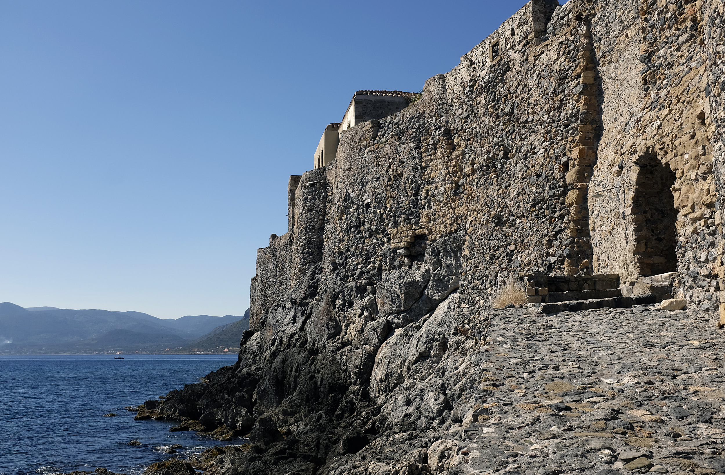 Είναι Άνοιξη, με ένα ελαφρύ βοριαδάκι να ταρακουνά την επιφάνεια των πεντακάθαρων νερών και να αυξάνει την ορατότητα στον ορίζοντα σε απίθανες αποστάσεις. Το μέγεθος του βράχου της Μονεμβασιάς αλλάζει μορφή και σχήμα ανάλογα στη θέση του παρατηρητή/περιπατητή αλλά και την ώρα της ημέρας και τη θέση του ήλιου στον ουρανό. Ένα έργο τέχνης της φύσης, μια απίθανη «κατασκευή» με ειδικό βάρος στη ζωή και την ιστορία του τόπου από τον 6ο μ.Χ. αιώνα. Το φως του πρωινού διαπερνά τα σκούρα γυαλιά κάνοντας όλες τις μορφές να μοιάζουν με σκιές. Η ατμόσφαιρα είναι τόσο καθαρή που επιτρέπει τη θέα στα δεξιά μέχρι τη «μύτη» του Αγίου Γεωργίου κάτω από το χωριό Φαρακλό. Στα αριστερά υψώνονται τα περίπου 200 μέτρα του πέτρινου όγκου, δημιουργώντας μια μικρή οφθαλμαπάτη του μεγέθους του καθώς περπατά κάποιος τον παραθαλάσσιο δρόμο.