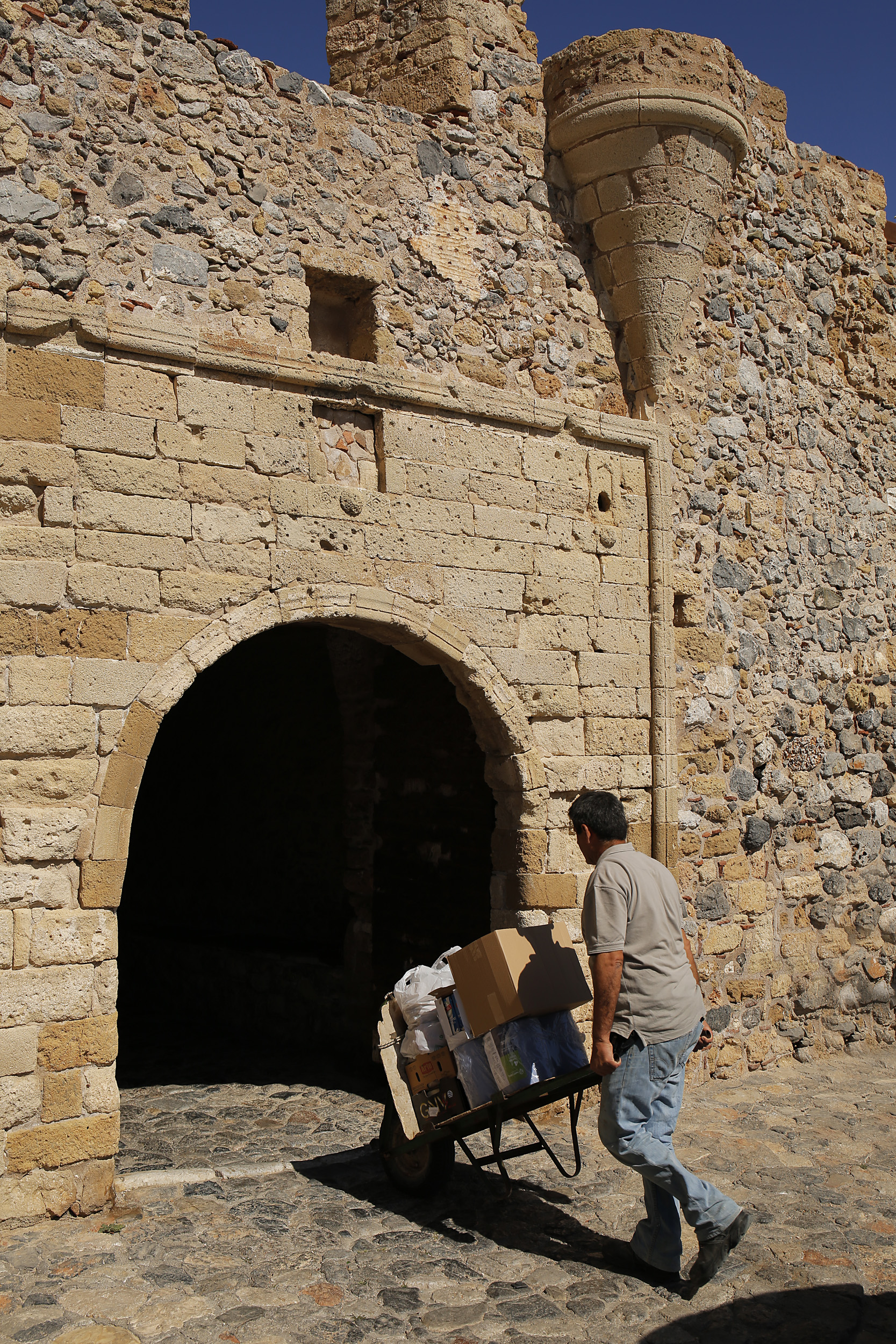 Καθώς η απόσταση με τη Δυτική είσοδο του Κάστρου λιγοστεύει, αυτοκίνητα παρκαρισμένα στη σειρά, μειώνουν την πεζοπορία στους εργαζόμενους αλλά και στους ιδιοκτήτες επιχειρήσεων του οικισμού. Τους καλοκαιρινούς μήνες, η πρόσβαση με ιδιωτικό όχημα είναι αδύνατη και οι επισκέπτες αλλά και οι ντόπιοι μεταφέρονται με συχνά δρομολόγια λεωφορείου το οποίο κάνει ακριβώς αυτή τη διαδρομή του 1,5 χιλιομέτρου. Ένα πλάτωμα μπροστά από την αψίδα της εισόδου, επιτρέπει την αναστροφή των οχημάτων αλλά και των τουριστικών λεωφορείων, τα οποία αφήνουν με χρονοδιακόπτη τους επισκέπτες να περιπλανηθούν στα σοκάκια του βυζαντινού οικισμού πριν επιστρέψουν να τους παραλάβουν ξανά, λίγες ώρες αργότερα. Εργαζόμενοι σε επιχειρήσεις εστίασης, ξεφορτώνουν προϊόντα και πρώτες ύλες σε καρότσια με επιμελώς ξεφούσκωτα λάστιχα για την απορρόφηση των κραδασμών των λιθόστρωτων. Εργασία αλλά και γυμναστική εξάσκηση υψηλών απαιτήσεων αφού για τον πλήρη ανεφοδιασμό χρειάζονται αρκετές βόλτες πάνω-κάτω.