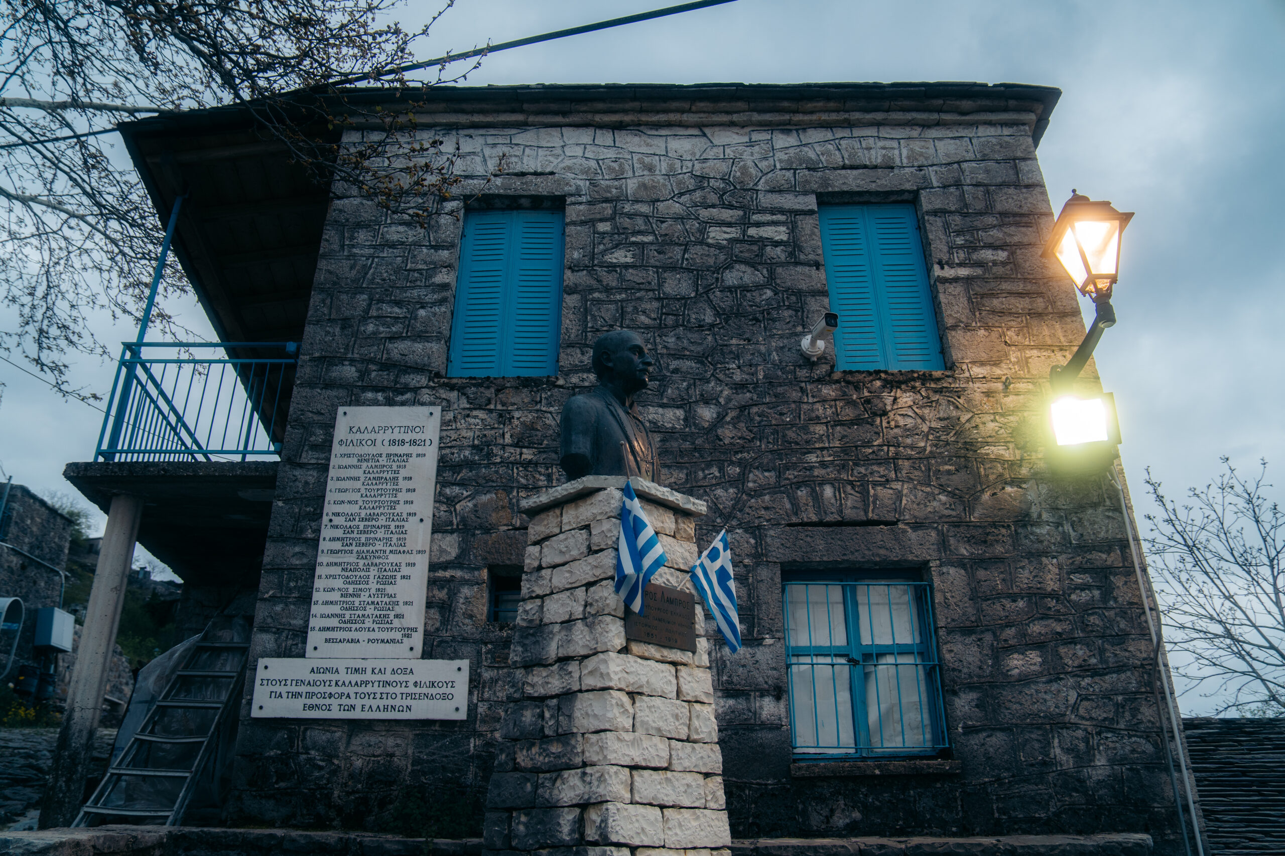 Στην πλατεία δεσπόζει μια μαρμάρινη στήλη με ονόματα, μέλη της Φιλικής Εταιρείας και πρωτεργάτες της επανάστασης των Καλαρρυτών. Αυτό που διαφέρει σε σχέση με άλλα ηπειρωτικά χωριά είναι η τοποθεσία της εκκλησίας του Αγίου Νικολάου -χτισμένη τον 15ο αιώνα- η οποία στέκεται σε περίοπτη θέση, αντί να βρίσκεται στην πλατεία. Καθόμαστε στον κτιστό τοίχο σαν σε θεωρείο αρχαίου θεάτρου και παρατηρούμε το κεντρικό καλντερίμι πλάι στην πλατεία, όπου θα βρούμε και την πηγή που γεμίζει τα μπουκάλια μας με παγωμένο, αναζωογονητικό νερό.