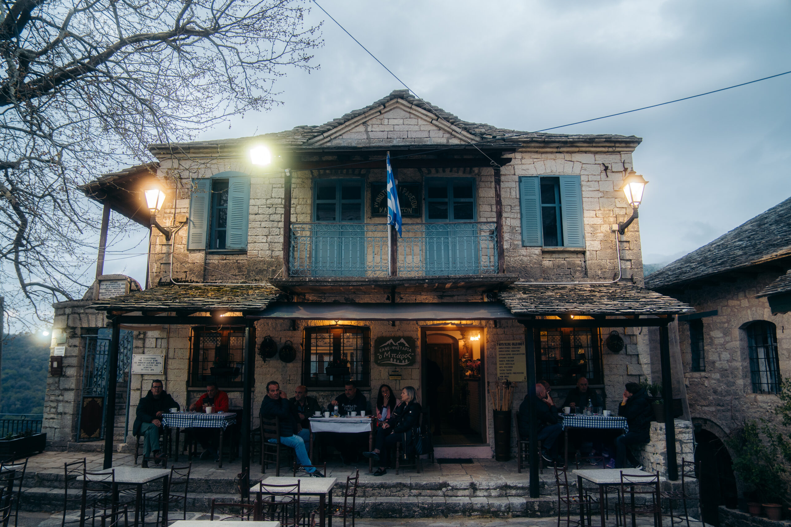 Στην κεντρική πλατεία θα καθίσουμε στο πετρόκτιστο ταβερνάκι «Μη με λησμόνει», που πήρε το όνομά του από το ορεινό φυτό με τον γαλάζιο ανθό. Έχοντας μπροστά μας θέα το κοινωνικό κέντρο του χωριού και τις χιονισμένες πλαγιές στα αριστερά, δύο φλιτζάνια ελληνικού καφέ και δύο ζεστά κομμάτια από τις θρυλικές ηπειρώτικες πίτες θα μας προσφέρουν ζεστασιά, κυριολεκτικά και μεταφορικά.