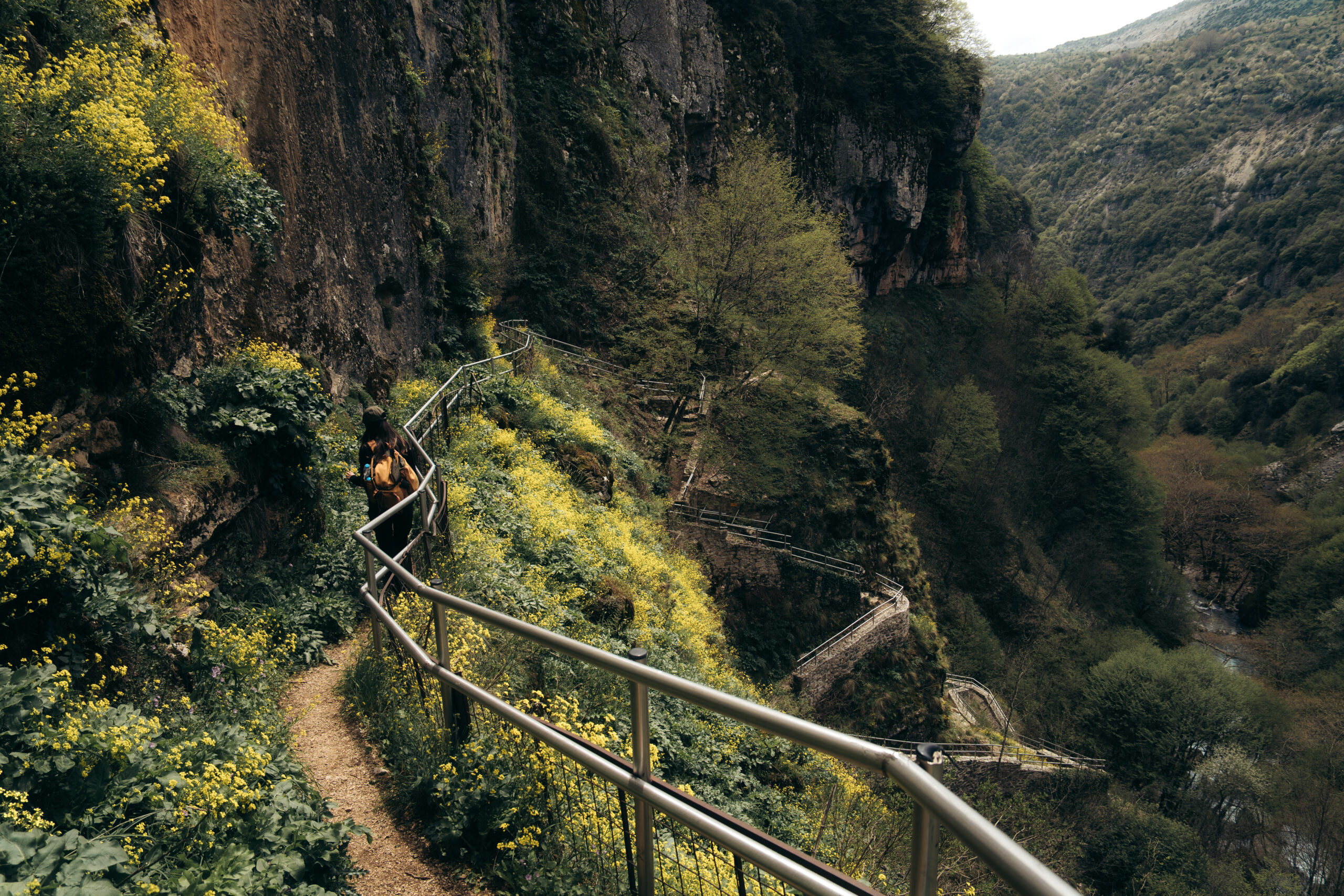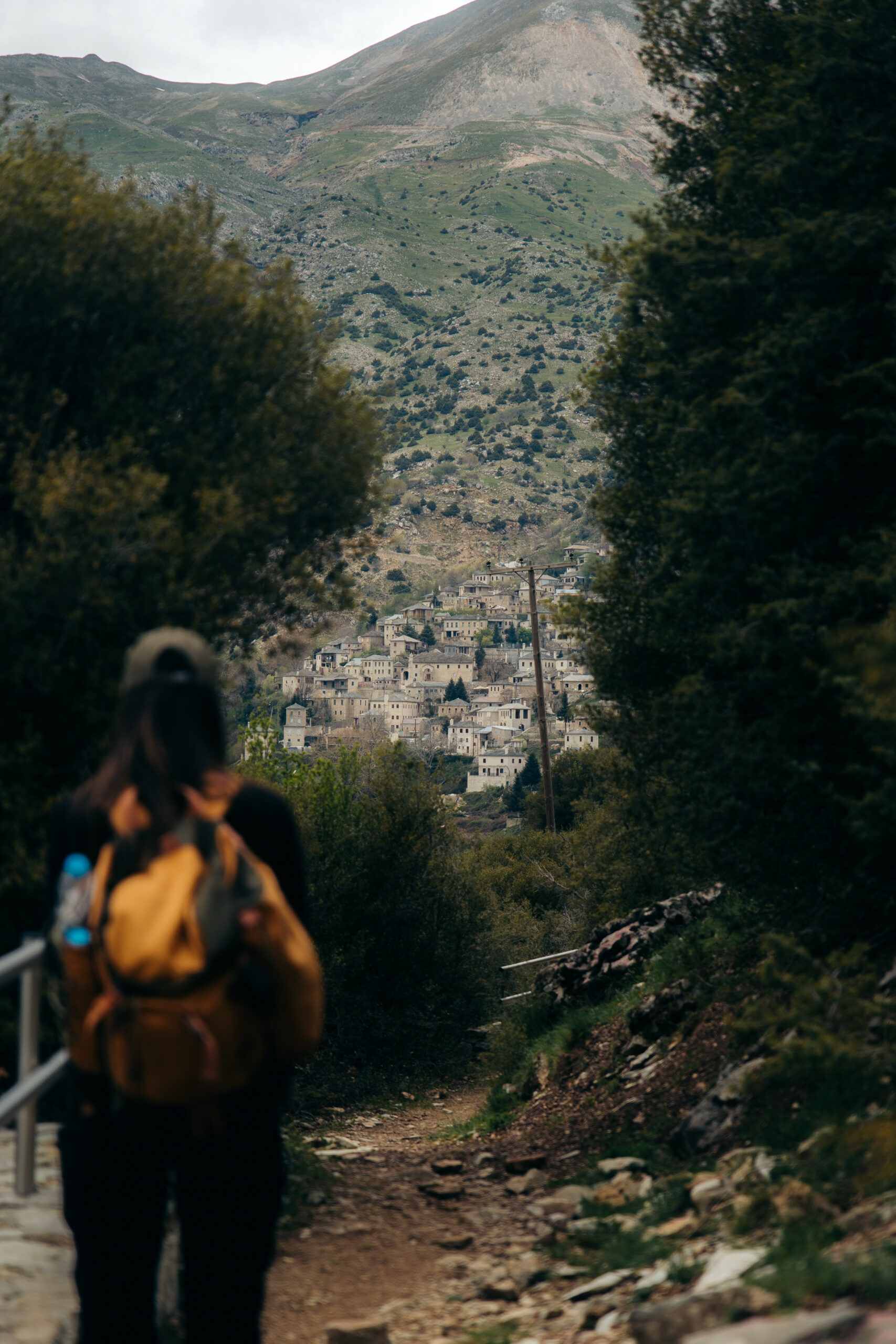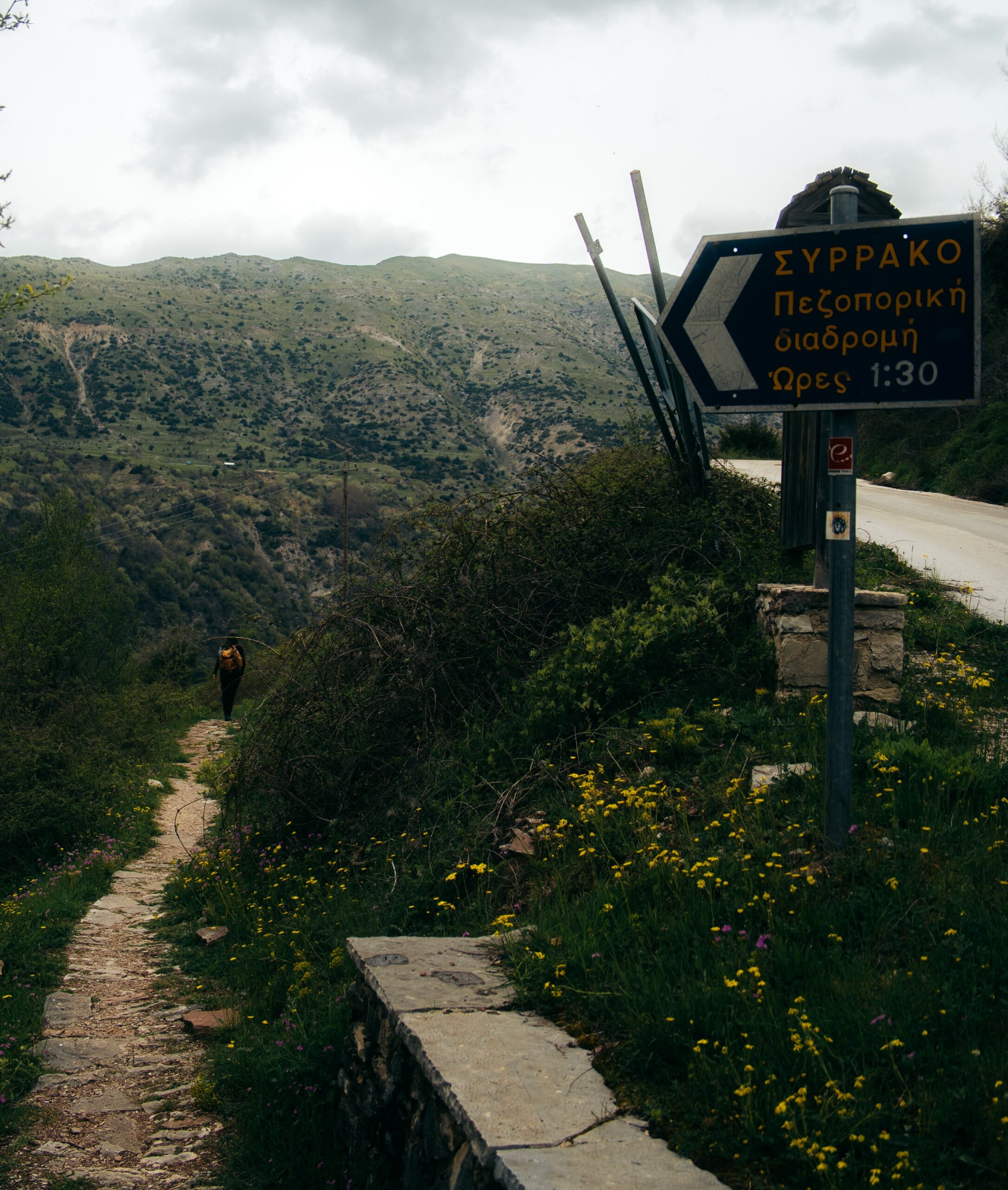 Λίγες κουβέντες ήταν αρκετές για να μας πείσουν να ξεκινήσουμε το ιστορικό μονοπάτι, μια από τις ομορφότερες διαδρομές που έχουμε διανύσει, και το συναίσθημα της ευγνωμοσύνης μας κυριεύει καθώς την ολοκληρώνουμε. Από την πλατεία του χωριού, συνεχίζουμε αριστερά και ένα λιθόστρωτο μονοπάτι μας οδηγεί έξω από το χωριό, ακολουθώντας την κόκκινη σήμανση του Epirus Trail, μέχρι να συναντήσουμε τον ασφαλτόδρομο. Πεζοπορούμε σε ένα ευδιάκριτο μονοπάτι, σε πλαγιά με ξεχωριστή χλωρίδα, ενώ σε ορισμένα σημεία απαιτείται προσοχή καθώς αρχίζουμε να κατηφορίζουμε την απότομη χαράδρα.