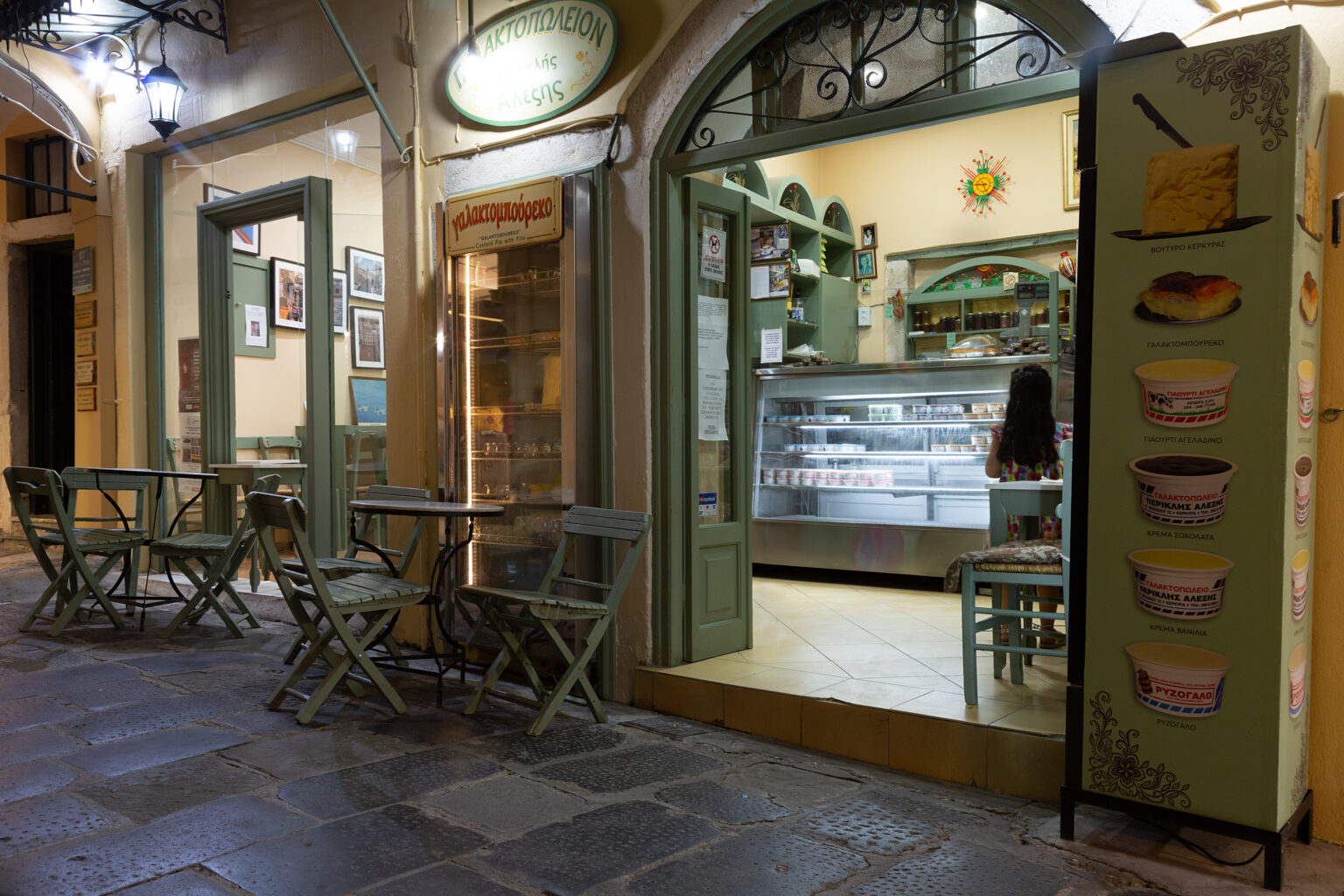 Σε ισοπαλία κατέληγε και το debate μεταξύ βανίλιας ή σοκολάτας για τις παραδοσιακές κρέμες με τη μαμαδίστικη γεύση, στο αυθεντικό και ανεπιτήδευτο γαλακτοπωλείο Περικλής Αλέξης, που από μανάβικο του παππού το 1927 μετεξελίχθηκε σε γαλακτοπωλείο από τον γιο Κωνσταντίνο. Τον βρίσκαμε καθημερινά πίσω από τον μικρό πάγκο, σχεδόν τον μισό από τον οποίο καταλαμβάνει ένα γιγάντιο κομμάτι μυρωδάτο, φρέσκο βούτυρο Κερκύρας, με την τρίτη γενιά της επιχείρησης πλάι του. Εκεί, βουτούσαμε λαίμαργα το κουτάλι μας στις πλούσιες κρέμες που λατρεύουν οι Κερκυραίοι και που παρασκευάζονται αποκλειστικά από γάλα των αγελάδων της οικογένειας στην Καστανιά Κέρκυρας. Εκτός από γιαούρτια και ρυζόγαλο, απολαύσαμε επίσης καταπληκτικό γαλακτομπούρεκο με πλούσια κρέμα, φυσικά με το δικό τους εξαιρετικής ποιότητας βούτυρο.