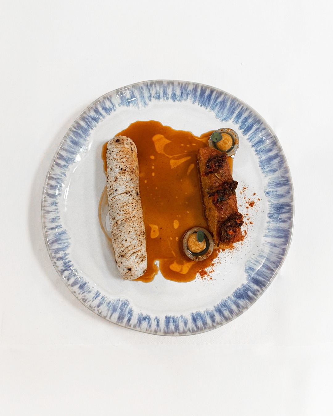 Με τα αινιγματικά τους ονόματα, τα πιάτα αφηγούνταν ιστορίες. Όπως το «Από την Τήνο στη Μάνη μέσω Ιταλίας» -ένα θεϊκό caccio e pepe με γαρίδες- που μας διακτίνισε στον τόπο καταγωγής του chef, ενώ η «Κολομπίνα πριν τη νύχτα του γάμου» πάντρευε εξαιρετικά το ψητό περιστέρι με τα ροδάκινα. Μια τελετουργική εμπειρία, αληθινή βουτιά στην απόλαυση.