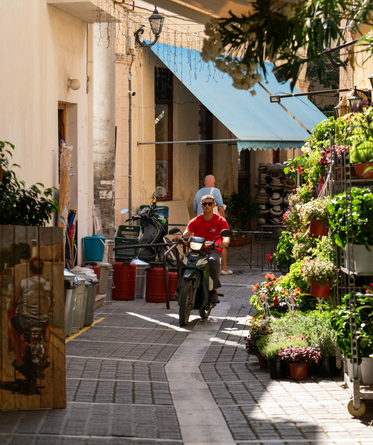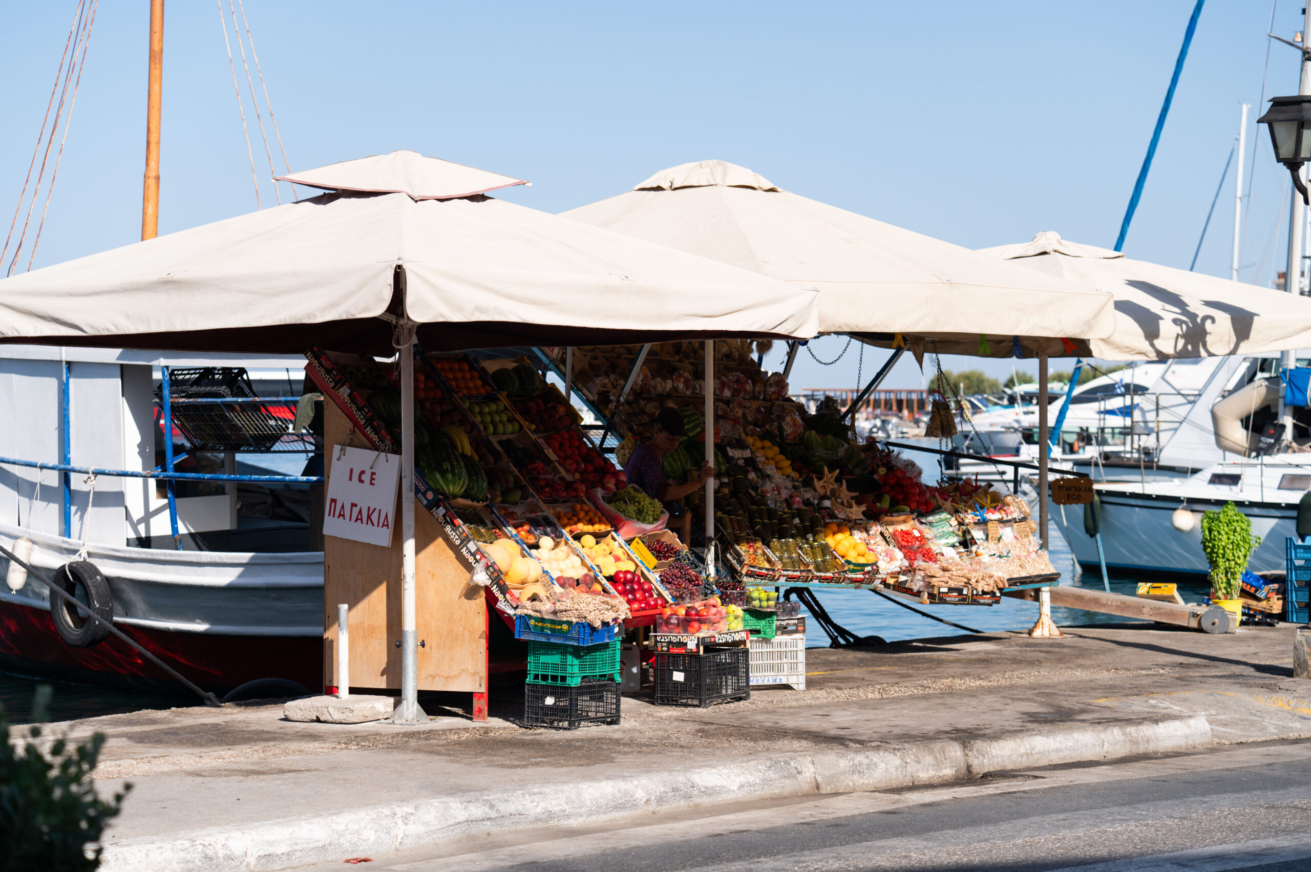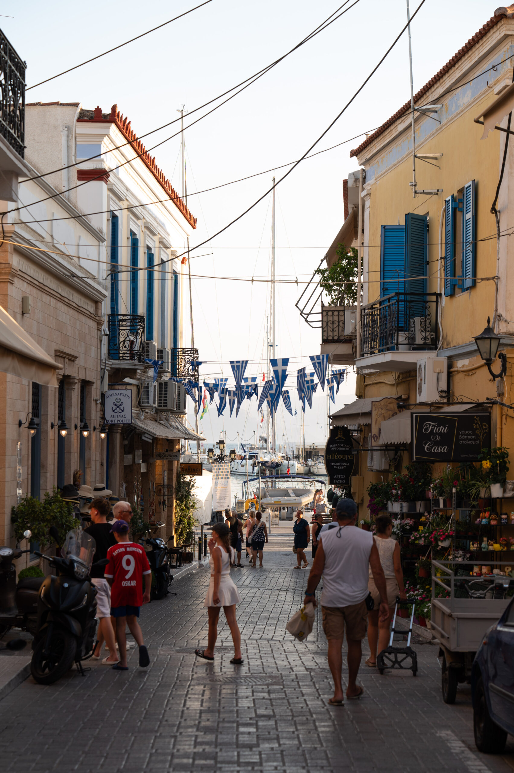 Με το παγωτό στο χέρι και περίσσια πρωινή ενέργεια, κατευθυνόμαστε προς το κέντρο της πόλης της Αίγινας. Το παραλιακό μέτωπο γεμάτο με καφενεία, ταβέρνες, εστιατόρια, ζαχαροπλαστεία, φούρνους, με μυρωδιές που γεμίζουν την ατμόσφαιρα και σε προσκαλούν. Τη διαδρομή μας γεμίζουν με χρώματα οι πάγκοι με φρούτα και λαχανικά κατά μήκος του λιμανιού: ροδάκινα, σταφύλια, καρπούζια, ντοματίνια και κάθε λογής φρούτα και λαχανικά που μοσχοβολούν θάλασσα. Λες και όλα τα αγκαλιάζει μία λεπτή κρούστα αλμύρας απ’ το θαλασσινό αεράκι –κάνοντας την αίσθηση του καλοκαιριού ακόμα πιο έντονη.