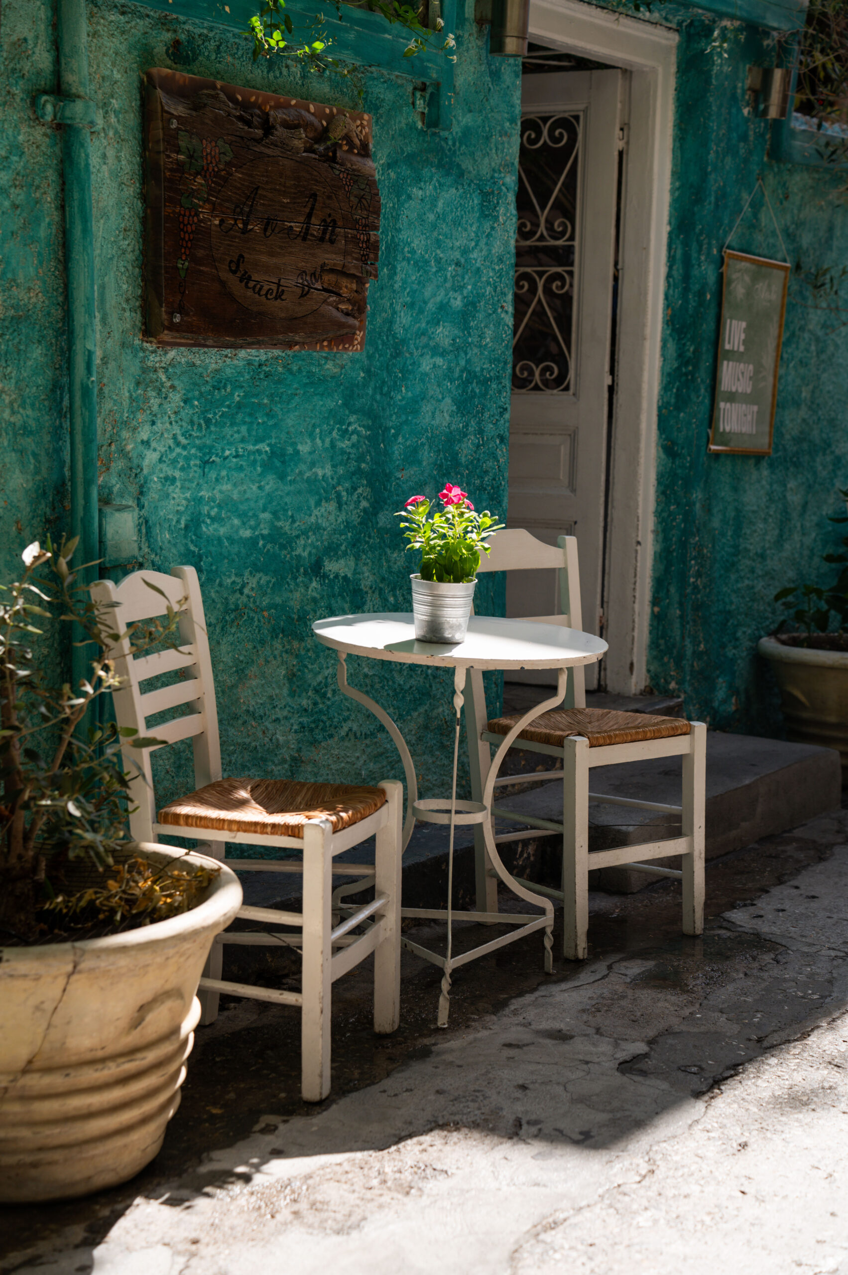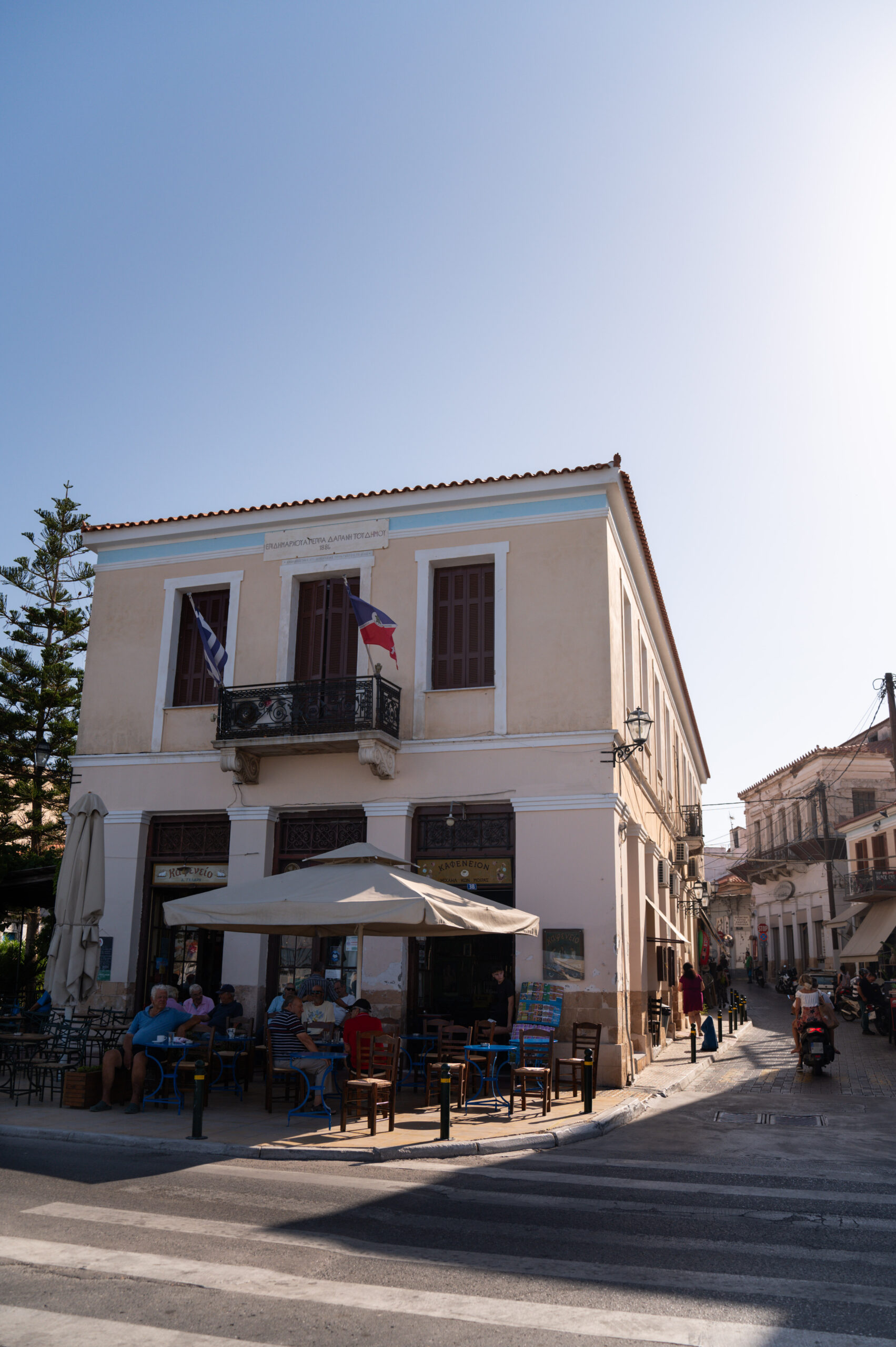 Με τη άκρη του ματιού μας παρατηρούμε απέναντί μας, γραφικά μεταλλικά μπλε τραπεζάκια και ξύλινες καρέκλες με ψάθα. Πλησιάζουμε κοντά και ξάφνου βρισκόμαστε μερικά χρόνια πίσω, στο παραδοσιακό καφενείο του Μιχάλη Μοίρα, που από το 1953 στέκει φρουρός μιας άλλης εποχής. Οι τοίχοι, στολισμένοι με κάδρα παλιών φωτογραφιών, συνθέτουν ένα σιωπηλό μωσαϊκό με τις ιστορίες των ανθρώπων που πέρασαν απ’ το νησί. Στα τραπεζάκια, τα φλιτζανάκια με τον ελληνικό καφέ καθρεφτίζουν τη θάλασσα και οι κουβέντες ανάμεσα στους ηλικιωμένους θαμώνες δεν έχουν τελειωμό.