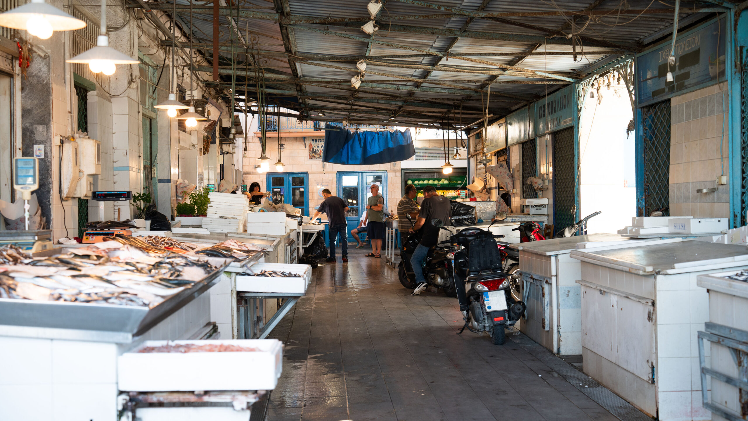 Η υπαίθρια ψαραγορά της Αίγινας, με τα ιχθυοπωλεία γεμάτα φρέσκα ψάρια, είναι ο επόμενος σταθμός. Η ψαριά της μέρας φαίνεται να είναι καλή και οι ψαράδες διαλαλούν με περηφάνια τα καμώματά τους. Το άρωμα της θάλασσας και της αλμύρας και η μυρωδιά του φρέσκου ψαριού πλημμυρίζουν την ατμόσφαιρα -εδώ η θάλασσα περνά απευθείας από το κύμα στο τραπέζι. «Μαρία, βάλε μου 1 κιλό γαύρο. Θα τον κάνω τηγανητό για μεσημέρι σήμερα!», ακούω μία ηλικιωμένη κυρία να παραγγέλνει σε έναν πάγκο δίπλα μου, φορώντας το ψάθινο καλοκαιρινό καπέλο της και ένα ροζ φόρεμα γεμάτο λουλούδια.