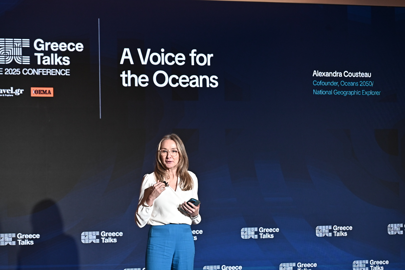 Η συνιδρύτρια του οργανισμού Oceans 2050 και National Geographic Explorer, Alexandra Cousteau, ανέβηκε στη σκηνή του Greece Talks για να μιλήσει για τον ρόλο της Ελλάδας στη νέα εποχή των ωκεανών. Ξεκίνησε σημειώνοντας ότι η χώρα διαθέτει μια «μεγάλη, ζωντανή κοινότητα θάλασσας» και ότι η υγεία των θαλασσών δεν είναι πολυτέλεια, αλλά προϋπόθεση για το μέλλον της.