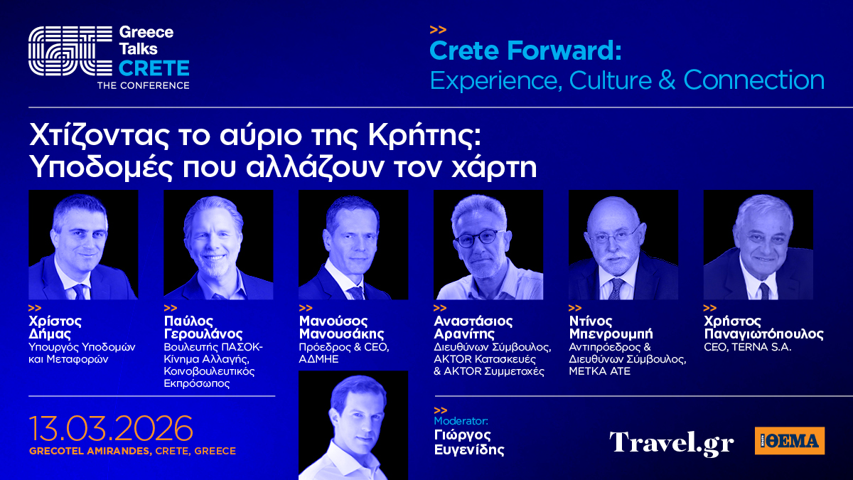 Μία μεγάλη συζήτηση γύρω από τις νέες επενδύσεις, τα έργα υποδομών και το αυξανόμενο διεθνές ενδιαφέρον που διαμορφώνουν τη σύγχρονη ταυτότητα του νησιού της Κρήτης, θα λάβει χώρα στο συνέδριο Greece Talks, Crete Forward: Experience, Culture & Connection που διοργανώνει την Παρασκευή 13 Μαρτίου, στο Grecotel Amirandes στην Κρήτη, το Travel.gr, το Νο1 ταξιδιωτικό site της Ελλάδας, σε συνεργασία με το Πρώτο Θέμα.