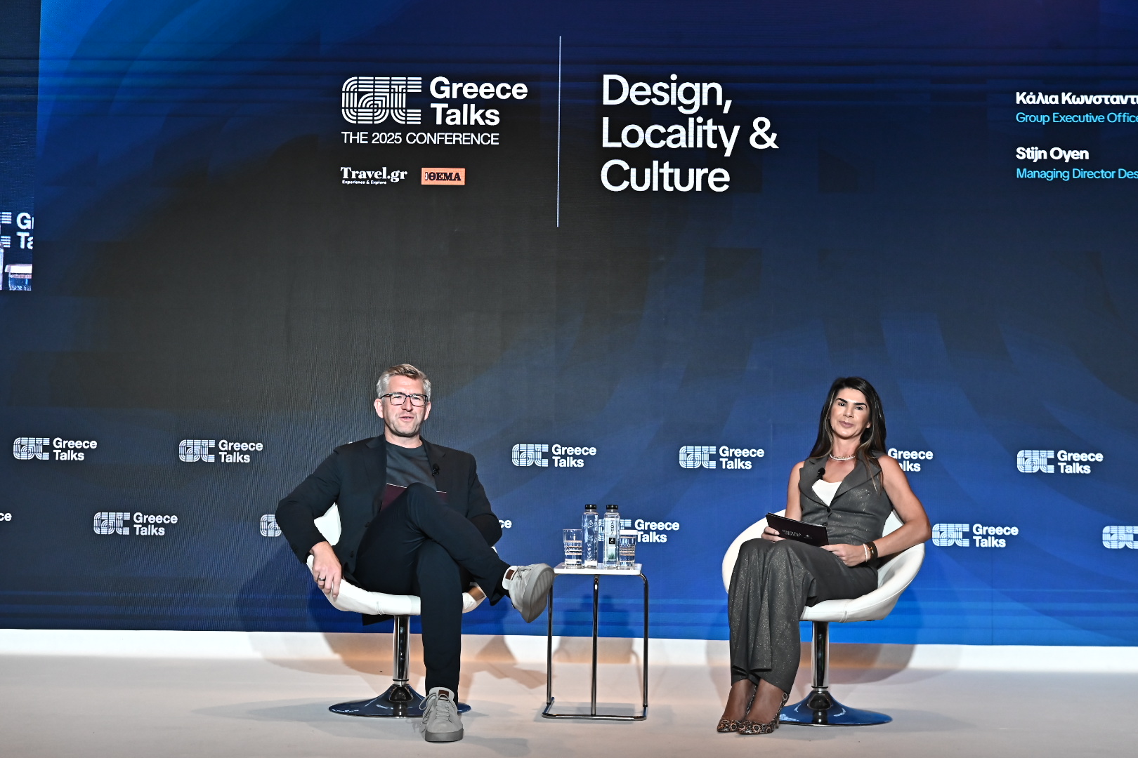 Η συζήτηση ξεκίνησε με το βλέμμα στραμμένο στο μέλλον της φιλοξενίας, στην ελληνική ιδιαιτερότητα και στον τρόπο με τον οποίο ο σχεδιασμός μπορεί να γίνει αφήγηση. Η Κάλια Κωνσταντινίδου μίλησε για τη σχέση της με τον χώρο και την ανάγκη η φιλοξενία να παραμένει ριζωμένη στο περιβάλλον της. Σημείωσε ότι ο δρόμος αυτός γίνεται ακόμη πιο ενδιαφέρων όταν μοιράζεσαι τη σκηνή με έναν άνθρωπο που έχει συμβάλει διεθνώς στη σύνδεση των ξενοδοχείων με την τοπική κοινωνία μέσα από τον σχεδιασμό. Απευθυνόμενη στον Stijn Oyen, υπενθύμισε ότι η σχέση του Design Hotels με την Ελλάδα έχει διάρκεια και βάθος: από τη Σαντορίνη και την Πάρο μέχρι το νέο project της Μήλου. Ρώτησε ευθέως τι σημαίνει για εκείνον «ελληνική φιλοξενία» και αν κατανοεί την ουσία της. Ο ίδιος ανταποκρίθηκε τονίζοντας ότι η φιλοξενία στην Ελλάδα είναι θεμελιωμένη σε αρχαίες πολιτισμικές αξίες: γενναιοδωρία, ενσυναίσθηση, ανθρώπινη σύνδεση. Υπογράμμισε ότι πρόκειται για κάτι πέρα από την ευγένεια ή τις υπηρεσίες. Είναι μέρος του DNA της χώρας.