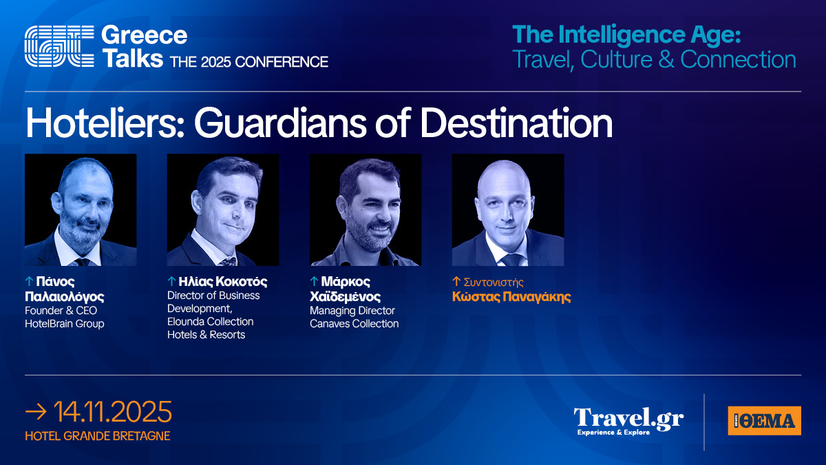 Το Travel.gr, το μεγαλύτερο ταξιδιωτικό site στην Ελλάδα, και το Πρώτο Θέμα διοργανώνουν την Παρασκευή 14 Νοεμβρίου στo ξενοδοχείο Grande Bretagne το συνέδριο Greece Talks με τίτλο «The Intelligence Age: Travel, Culture & Connection».