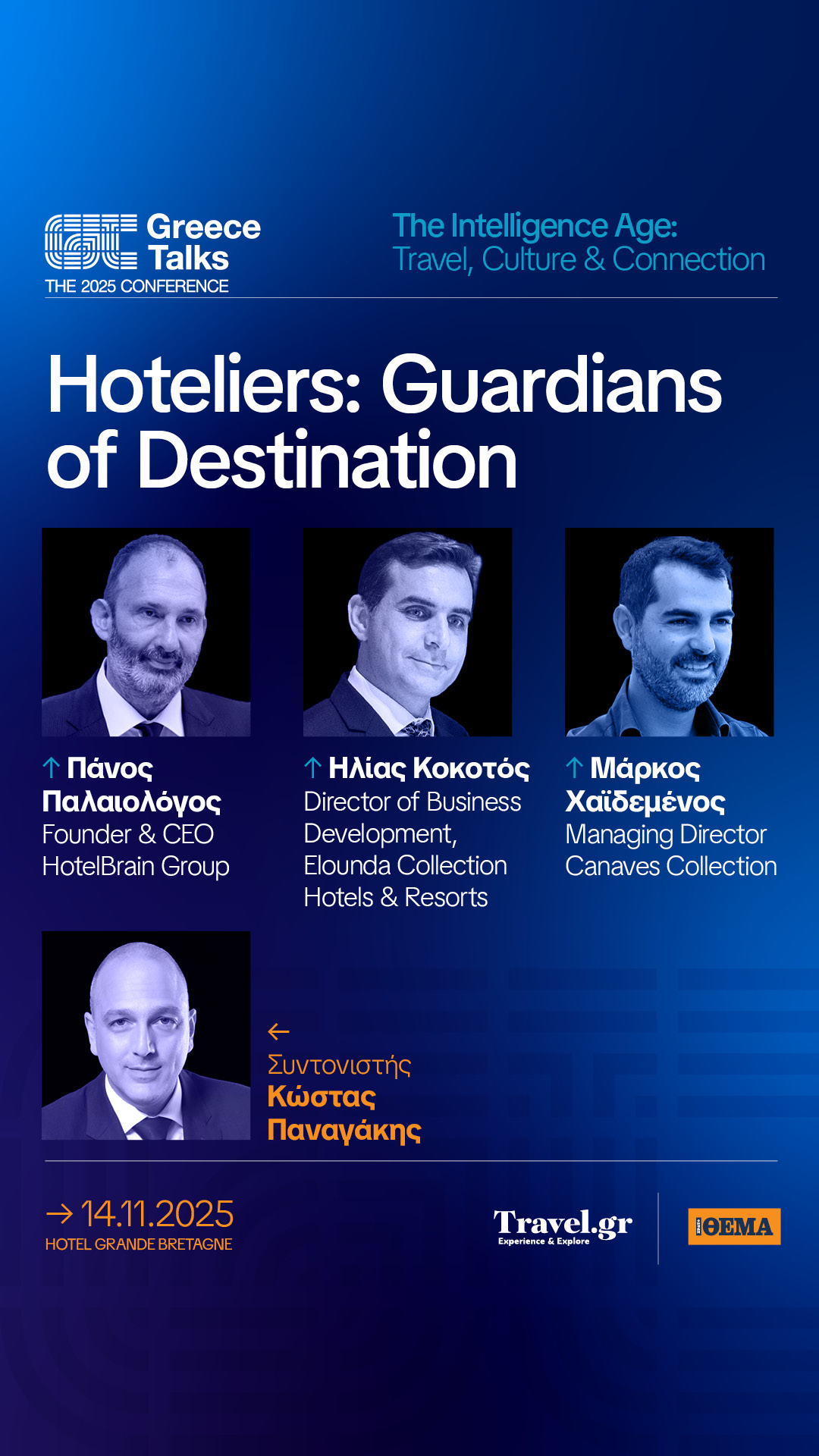 Το Travel.gr, το μεγαλύτερο ταξιδιωτικό site στην Ελλάδα, και το Πρώτο Θέμα διοργανώνουν την Παρασκευή 14 Νοεμβρίου στο ξενοδοχείο Μεγάλη Βρεταννία το 5ο συνέδριο Greece Talks με τίτλο «The Intelligence Age: Travel, Culture & Connection».