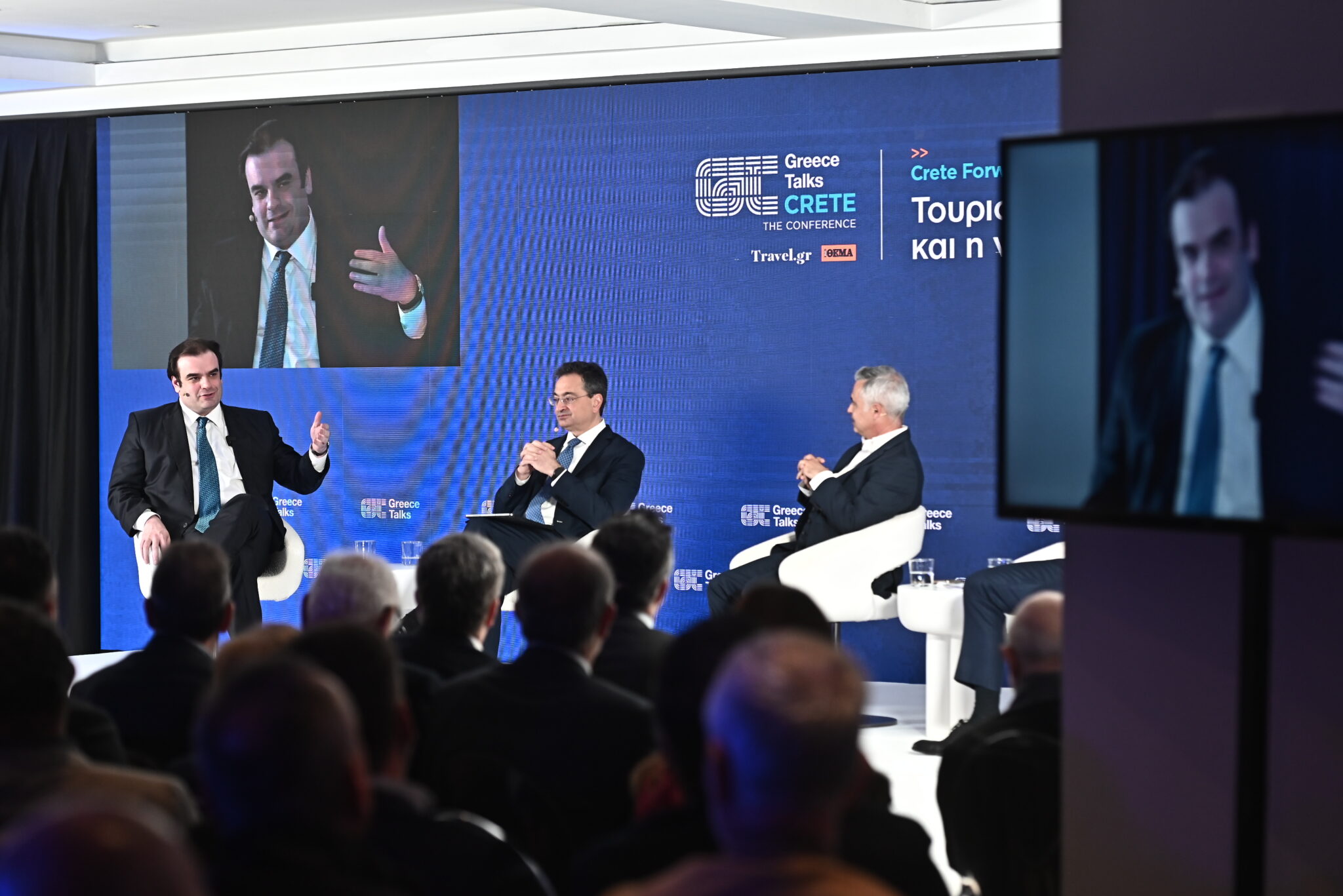 Στο πάνελ με τίτλο «Τουρισμός, ανάπτυξη και η νέα μεγάλη ευκαιρία» συμμετείχαν ο Υπουργός Εθνικής Οικονομίας και Οικονομικών και Πρόεδρος του Eurogroup Κυριάκος Πιερρακάκης, ο Chief Executive Officer της Τράπεζας Eurobank Α.Ε. Φωκίων Καραβίας και ο CEO της εταιρείας Πλαστικά Κρήτης Μιχάλης Λεμπιδάκης. Τη συζήτηση συντόνισε ο δημοσιογράφος Αντώνης Σρόιτερ.