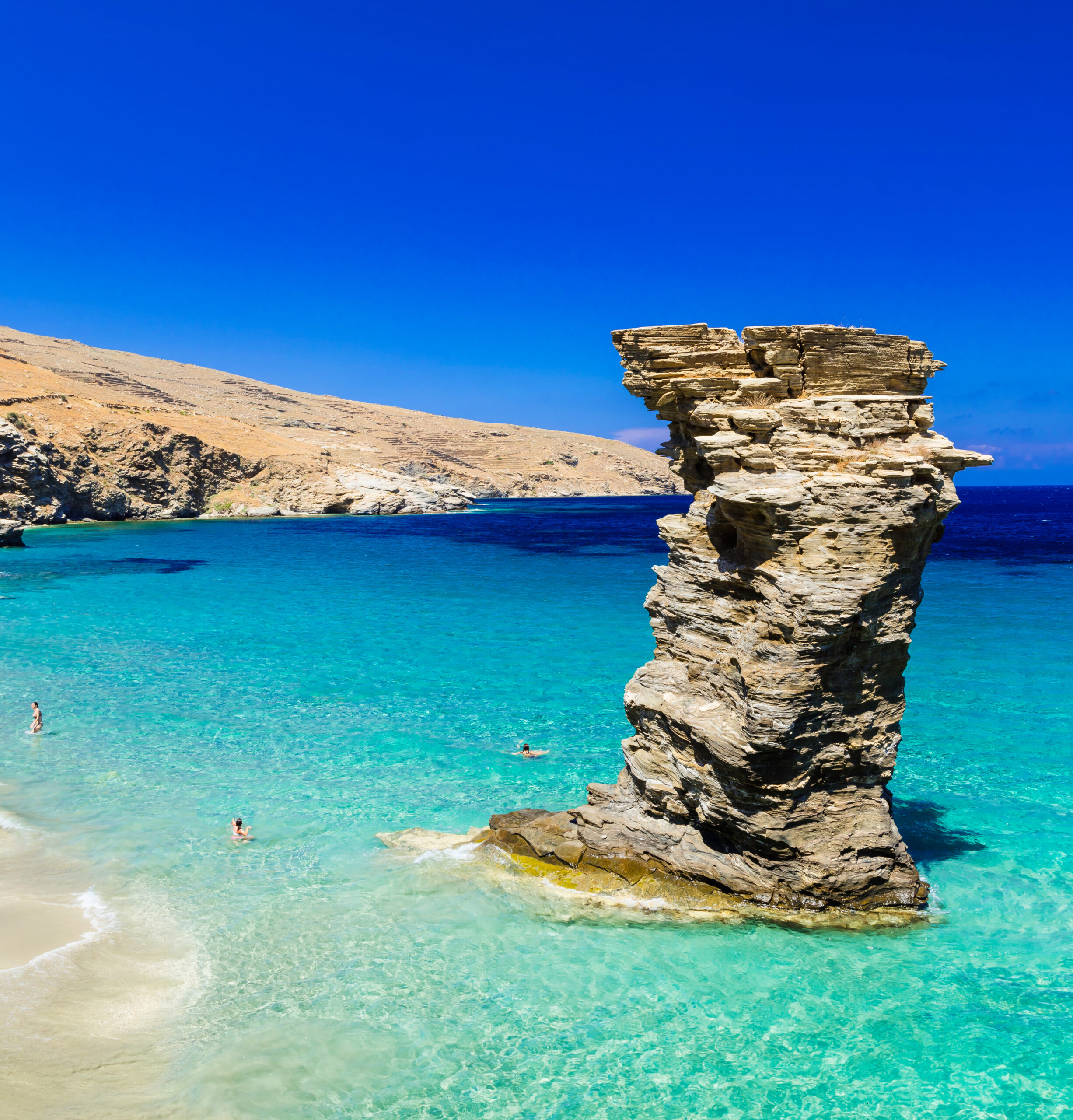 Η Laura Fowler δικαιολογεί απόλυτα την επιλογή της Άνδρου στη δεκάδα. Η φύση της είναι μοναδική για τα δεδομένα των Κυκλάδων, με τα ποτάμια που διατρέχουν την ορεινή ενδοχώρα να της χαρίζουν πλούσια βλάστηση – δάση, οπωρώνες και κτήματα εσπεριδοειδών – που κατηφορίζει τις πλαγιές σχηματίζοντας βάθρες με πεντακάθαρα νερά, τόσο δελεαστικά που είναι αδύνατο να μη βουτήξεις. Μονοπάτια διατρέχουν το νησί από άκρη σε άκρη, και το άρθρο προτρέπει τους λάτρεις της πεζοπορίας να διασχίσουν την Άνδρο από βορά προς νότο μέσα σε 10 μέρες. Αλλιώς ένα όχημα 4×4 αποδεικνύεται το πλέον κατάλληλο για τους συχνά δύσβατους χωματόδρομους που προσεγγίζουν τις «εκθαμβωτικές» όπως χαρακτηρίζονται οι ανδριώτικες παραλίες: απομονωμένες, μη οργανωμένες, χωρίς ξαπλώστρες, με υπέροχες αμμουδιές και τα πιο απίστευτα μπλε νερά.