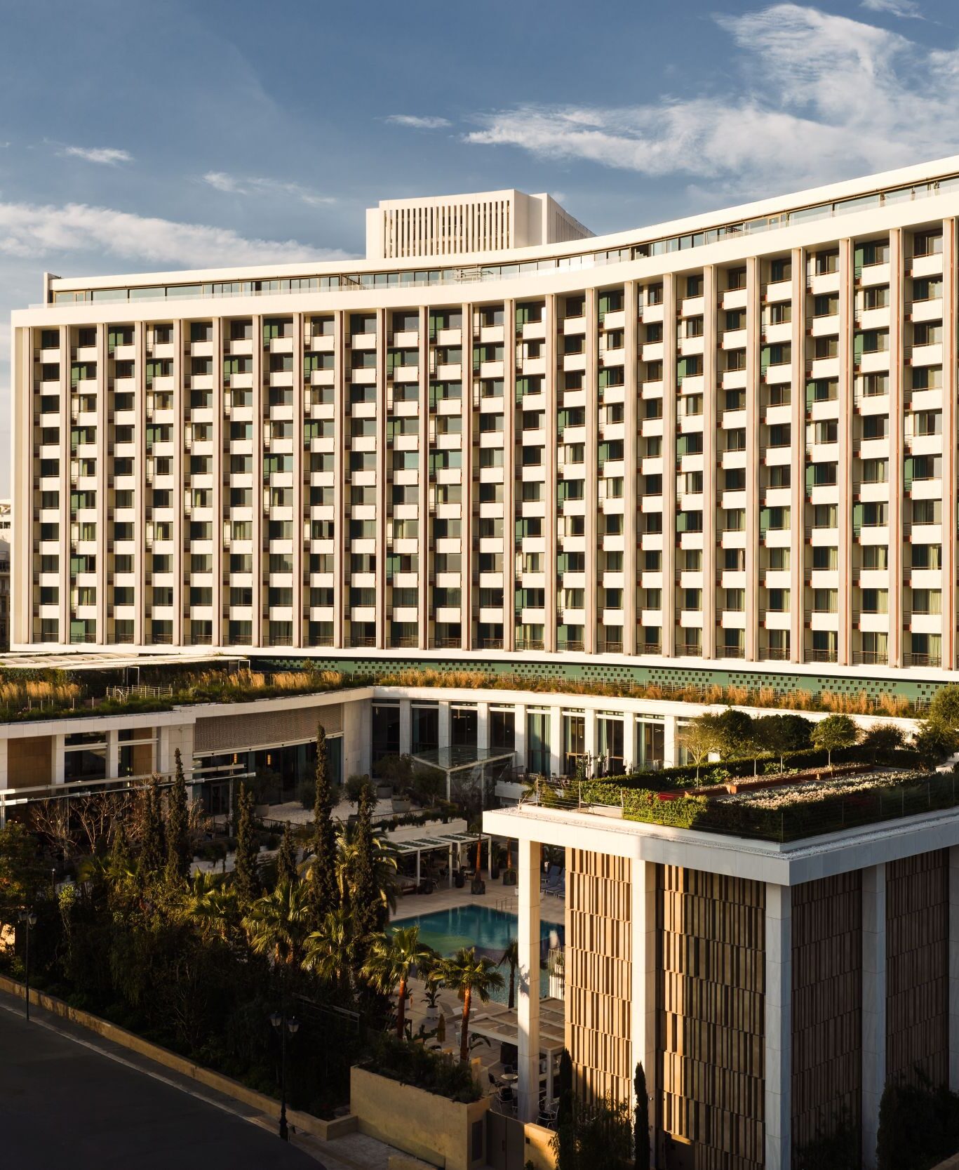 Όλες οι παρεμβάσεις έχουν γίνει με σεβασμό στον σχεδιασμό του αρχικού κτηρίου, που εγκαινιάστηκε το 1963 και αποτελεί ένα από τα σημαντικότερα οικοδομήματα της μοντέρνας μεταπολεμικής αρχιτεκτονικής στην Ελλάδα, καθώς συνδυάζει τις αρχές του διεθνούς ξενοδοχειακού σχεδιασμού, με έντονες αναφορές στα ελληνικά υλικά και την καλλιτεχνική παράδοση. Οι αρχικοί αρχιτέκτονες στους οποίους πιστώνεται ο σχεδιασμός του κτηρίου είναι ο Εμμανουήλ (Μανώλης) Βουρέκας, ο Προκόπης Βασιλειάδης, ο Αντώνης Γεωργιάδης και ο Σπύρος Στάικος.