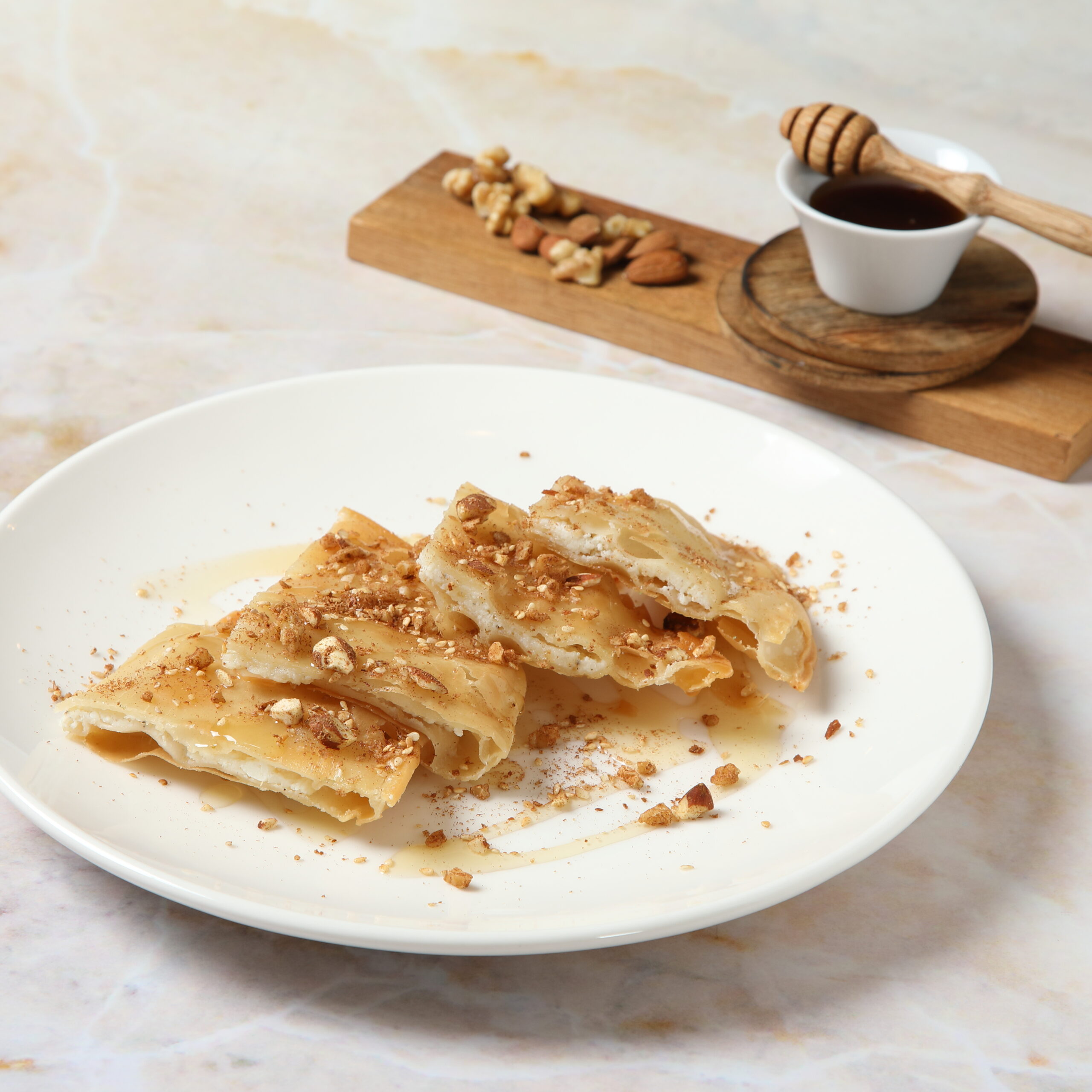 σερβίρεται με μέλι και καβουρδισμένους ξηρούς καρπούς (καρύδι, αμύγδαλο, σουσάμι)