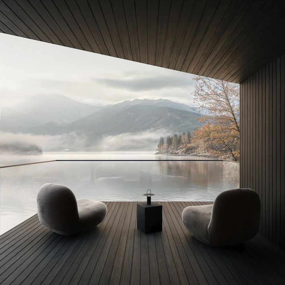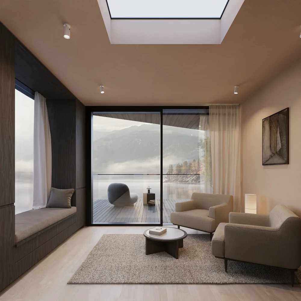 Και οι δύο τύποι διαθέτουν χειροποίητες κουζίνες και λουτρά, μεγάλα παράθυρα, φωταγωγούς, καθώς και ευρύχωρες ημιυπαίθριες βεράντες με θέα στη λίμνη. Η αισθητική τους κινείται στον άξονα της σκανδιναβικής λιτότητας, με φυσικά υλικά, καθαρές γραμμές και διακριτικές λεπτομέρειες που αναδεικνύουν τη σχέση του ανθρώπου με το τοπίο.