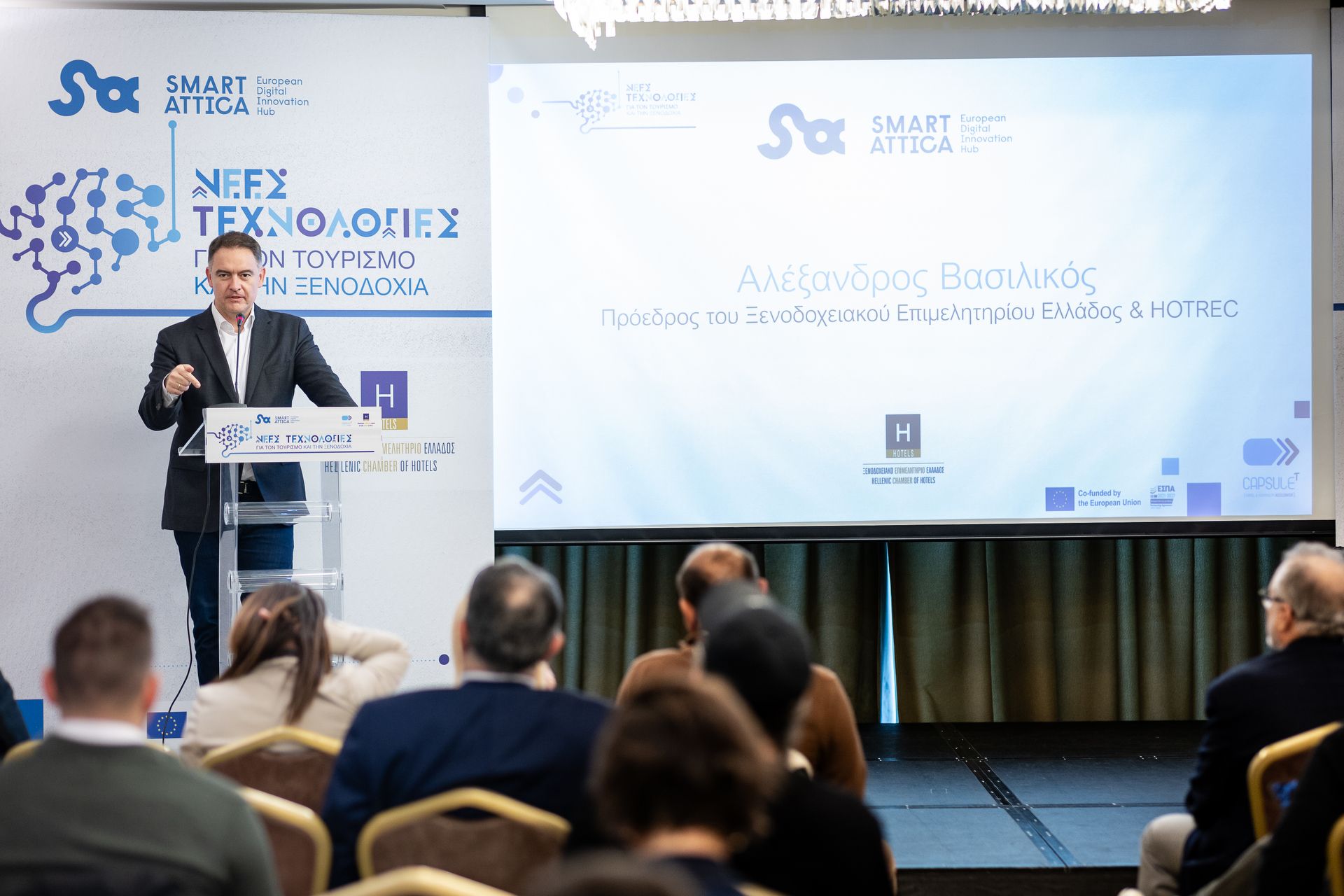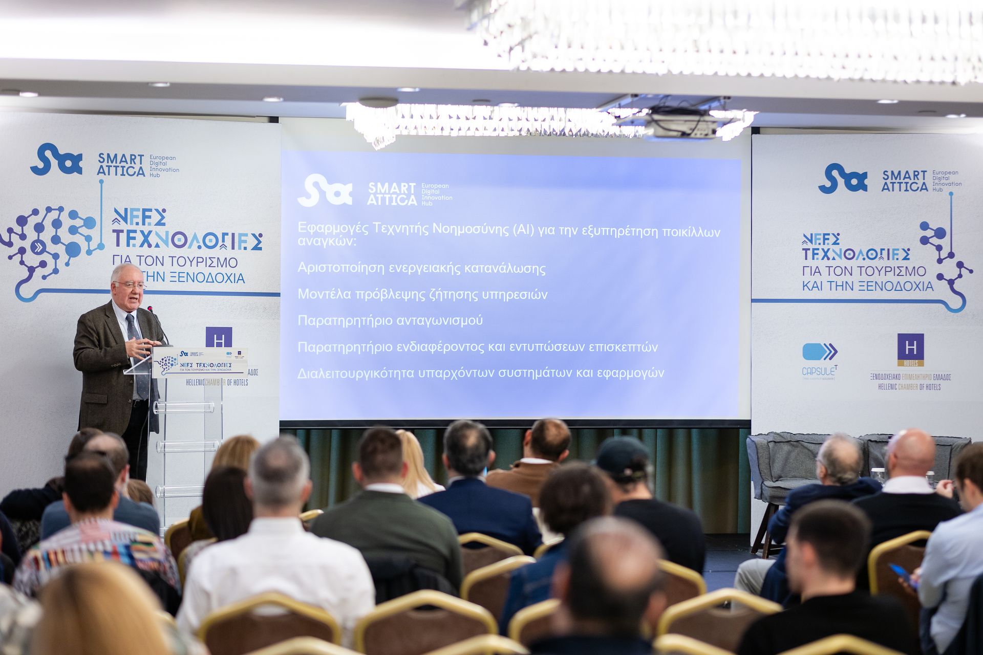 Κατά την διάρκεια έναρξης της εκδήλωσης ο πρόεδρος του ΞΕΕ κ. Αλέξανδρος Βασιλικός αναφέρθηκε στην πρωτοβουλία και στους σκοπούς της συμμετοχής του ΞΕΕ ως επίσημου συνεργάτη (partner) στο Smart Attica European Digital Innovation Hub (EDIH). Ακολούθως ο Manager του Smart Attica EDIH κ. Περικλής Τερλιξίδης ανέπτυξε τις δράσεις του European Digital Innovation Hub, ενώ η πρόεδρος του Ινστιτούτου Τουριστικών Ερευνών και Προβλέψεων κα Κωνσταντίνα Σβύνου παρουσίασε τα νέα ευρήματα της μελέτης του Ινστιτούτου αναφορικά με τις δυνατότητες Τεχνολογίας και Τεχνητής Νοημοσύνης στις ξενοδοχειακές επιχειρήσεις.