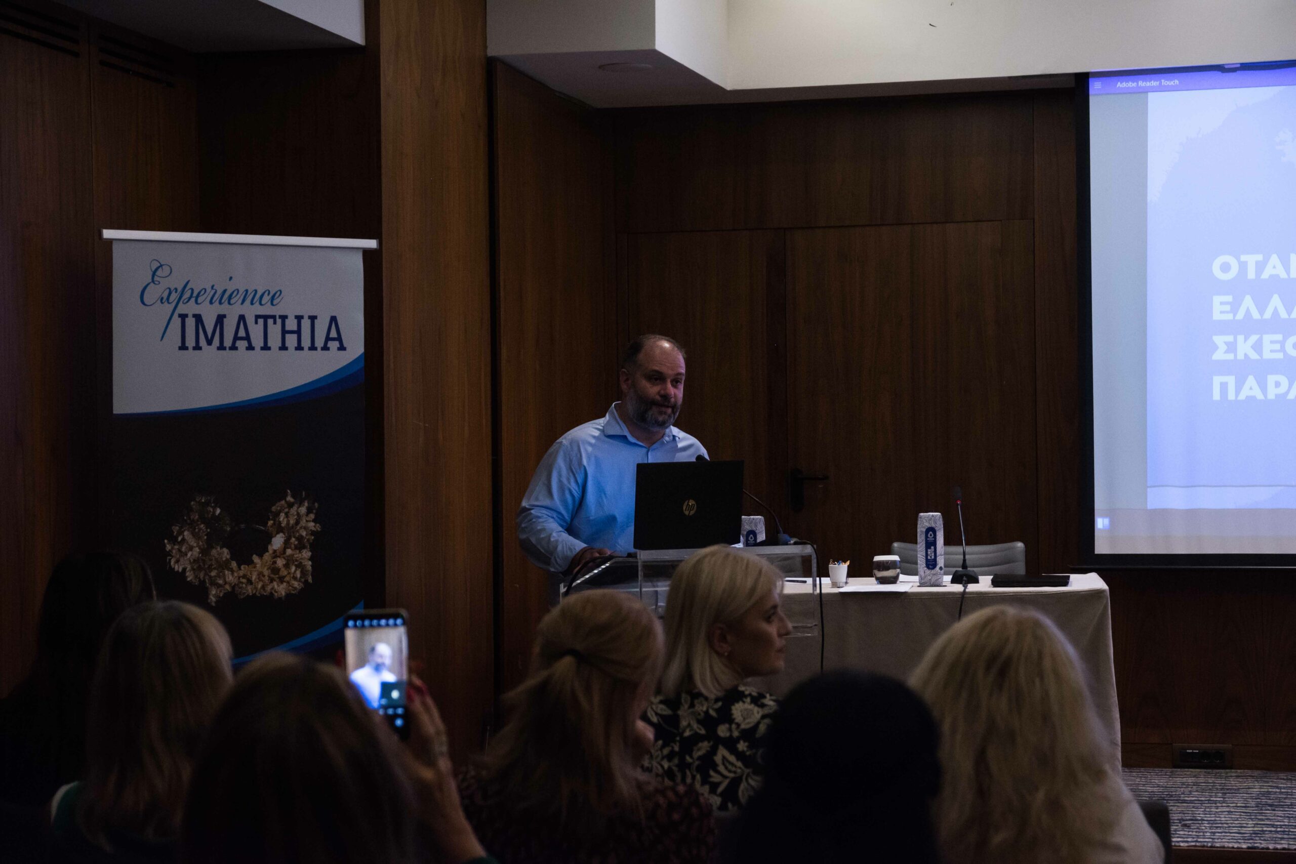 «Στόχος μας, μέσα από τη σημερινή δράση, να ξετυλίξουμε μπροστά σας, τους πλέον έμπειρους και ειδικούς εκπροσώπους των ΜΜΕ και του Τουρισμού, τον αρχαιολογικό και φυσικό μας πλούτο καθώς και τις μοναδικές γεύσεις της ευλογημένης αυτής γωνιάς της Μακεδονίας. Του τόπου όπου μοναδικά συνυπήρξαν οι δυο μέγιστοι της ανθρωπότητας. Ο Αλέξανδρος της Οικουμένης και ο φιλόσοφος Αριστοτέλης. Μεταφέροντας λοιπόν εικονικά την Ημαθία εδώ, σε αυτή την αίθουσα, φέρουμε μαζί μας και τα αρώματα και τις γεύσεις του τόπου μας μέσα από γαστρονομικές εμπειρίες με κυρίαρχα τοπικά μας προϊόντα όπως το ξινόμαυρο κρασί ονομασίας-προέλευσης, τις κομπόστες, το ροδάκινο, το μοναδικό ρεβανί Βέροιας, το εκλεκτό μας βόειο κρέας, τις πιπεριές Αγίου Γεωργίου, τις ντομάτες Ριζωμάτων και όχι μόνο».