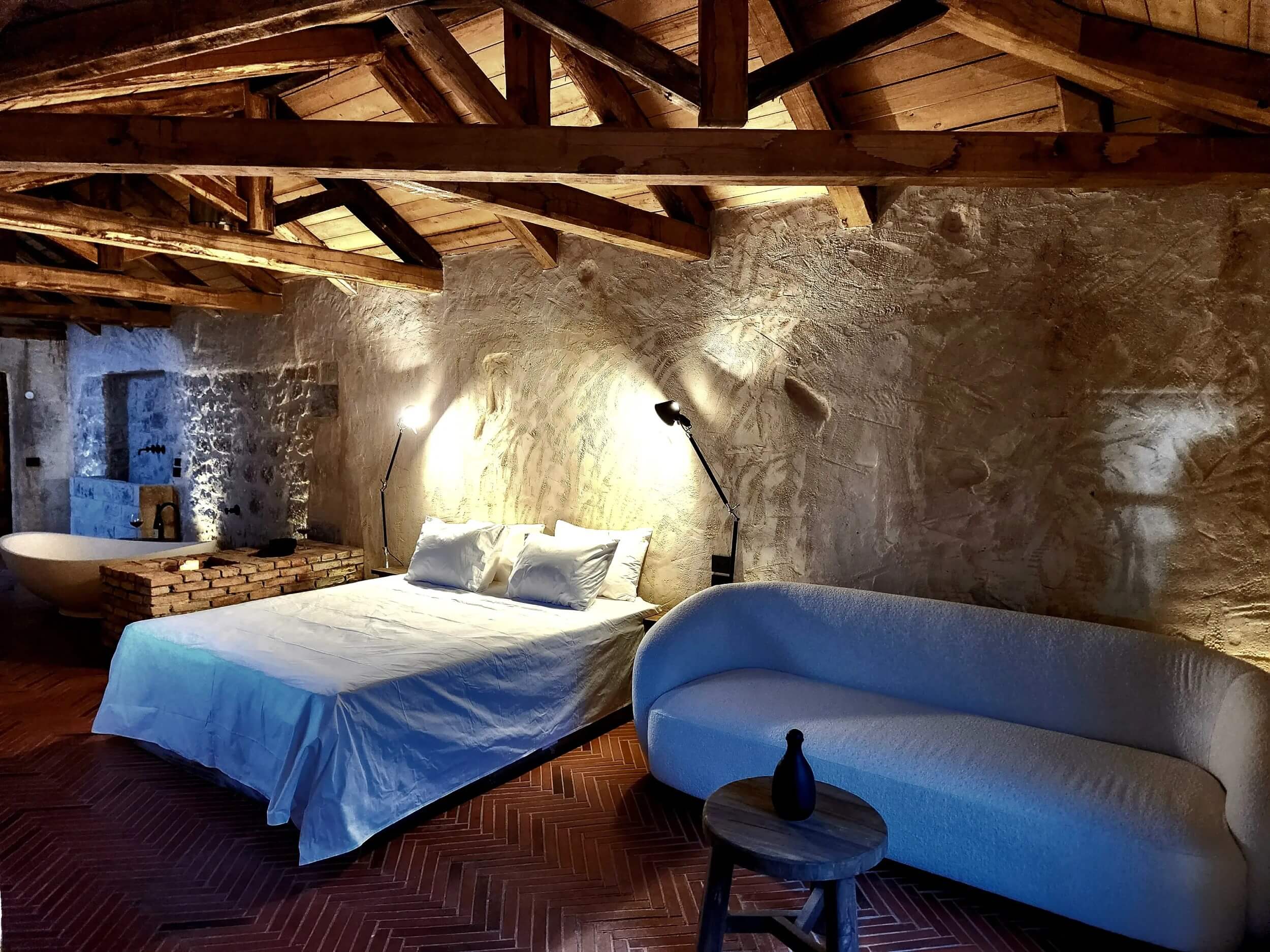 Τα ερείπια που βρέθηκαν στο σημείο και η εναρμόνιση με το γειτονικό μοναστήρι της Αγίας Θεοδώρας, αλλά και η τόσο “ζωντανή” ιστορία της βυζαντινής εποχής της Θεσσαλονίκης, αποτέλεσαν τον καμβά πάνω στον οποίο δημιουργήθηκε το μοναδικό αυτό project. Παντού παρούσες οι παραπομπές στη βυζαντινή εποχή, από την επιλογή των δομικών υλικών μέχρι τα αρχιτεκτονικά στοιχεία όπως οι κόγχες, το ύψος στις οροφές και οι καμάρες, μαζί με τις τέχνες όπως η χαρακτική σε ξύλο, τα ψηφιδωτά και τα υφαντά, δημιουργώντας ατμόσφαιρα εντυπωσιακή αλλά οικεία στον επισκέπτη. Το concept πέρασε σε όλα τα operations του ξενοδοχείου όπως το μενού, την επιλογή των κρασιών, τη διακόσμηση των δωματίων και των άλλων χώρων και όπως εξήγησε στη συνέχεια και η κ. Ζαρίφη, ακόμα και στο σχεδιασμό των λογοτύπων και της σήμανσης, όπου και πάλι αξιοποιήθηκαν χαρακτηριστικά σύμβολα του Βυζαντίου.