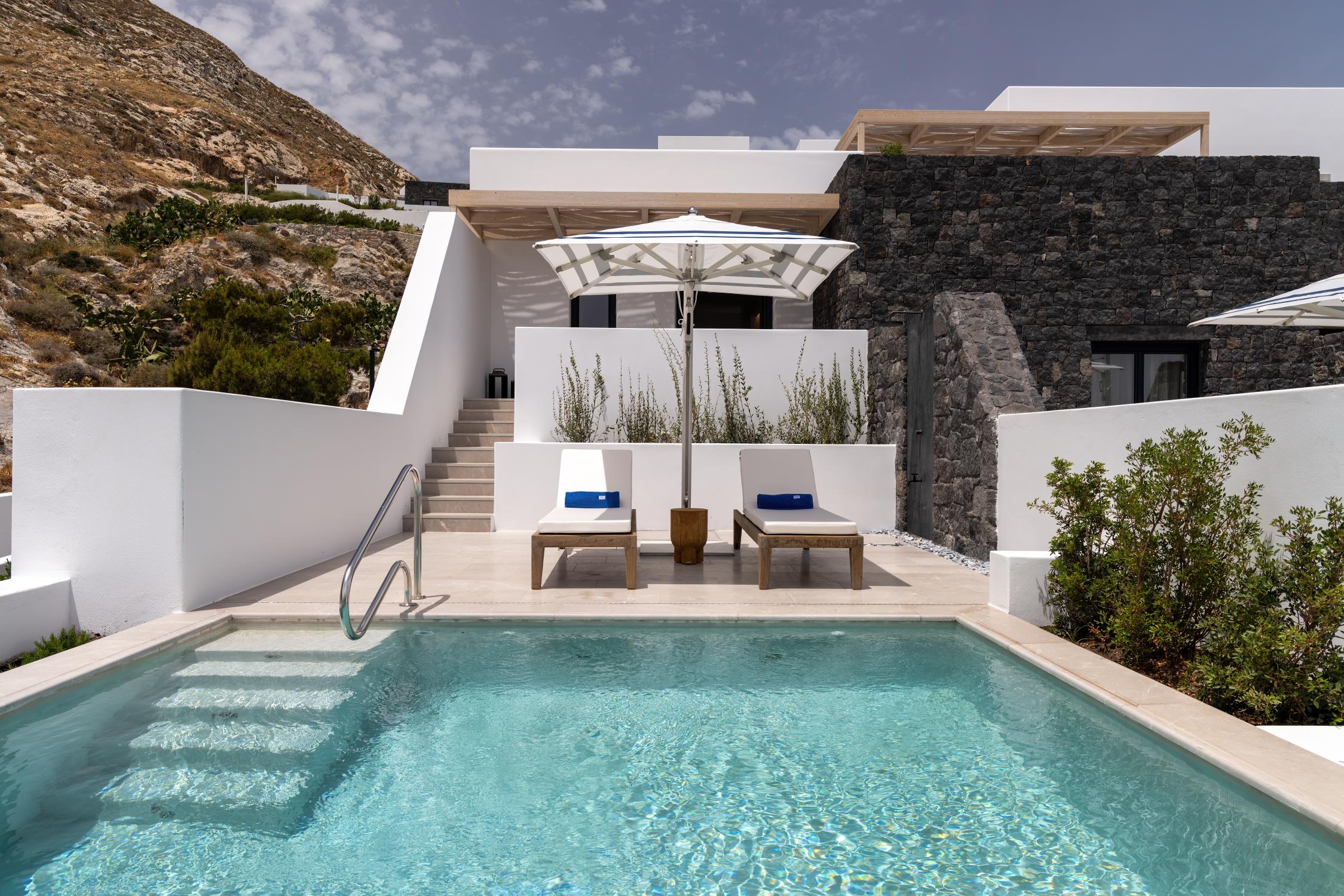 Χτισμένο αμφιθεατρικά στους πρόποδες της Αρχαίας Θήρας και πάνω από τη μαύρη παραλία στο Καμάρι, το Sandblu Santorini περιλαμβάνει 36 δωμάτια, 27 σουίτες και 3 βίλες, τα οποία συνδυάζουν το χαρακτηριστικό λευκό των Κυκλάδων με την ηφαιστειακή πέτρα και τους φυσικούς τόνους, αντανακλώντας τη γη και τον ουρανό της Σαντορίνης. Κάθε δωμάτιο, τα περισσότερα από τα οποία διαθέτουν ιδιωτική πισίνα, τιμά την τοπική παράδοση και τέχνη εντάσσοντας έντονα το φυσικό ξύλο, όσο οι αποχρώσεις αντλούν έμπνευση από τη θάλασσα και οι ιδιωτικές βεράντες συνδέουν τους εσωτερικούς χώρους με το εξωτερικό περιβάλλον. Οι βίλες προσφέρουν επίσης ιδιωτικές πισίνες και ευρύχωρες βεράντες.