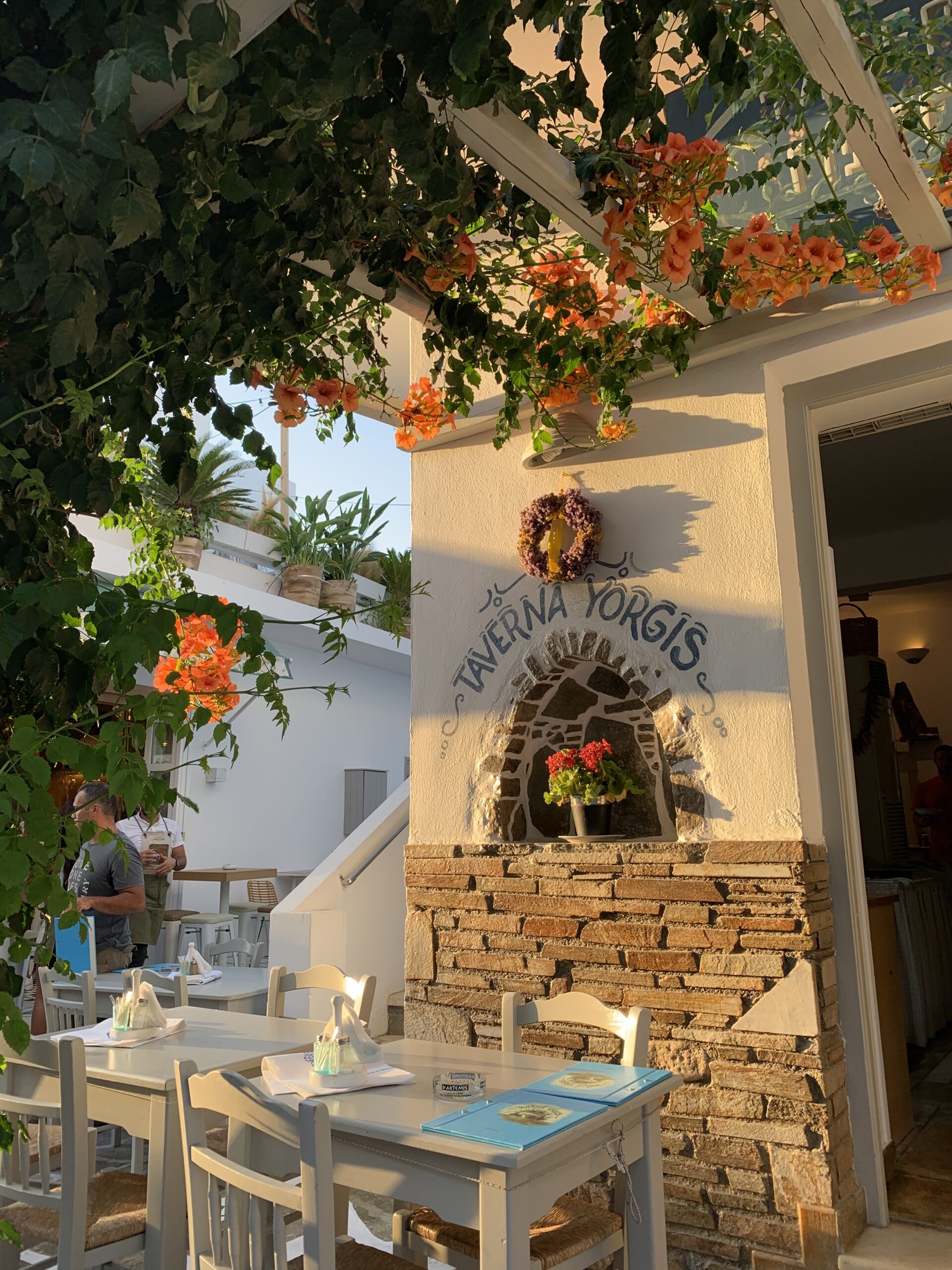 Όταν πλέον βραδιάζει κατηφορίζουμε προς την πόλη που στην ουσία αποτελείται από ένα κεντρικό στενό με όλα τα μαγαζάκια και τα εστιατόρια του νησιού. Ανεβαίνοντας τον κεντρικό δρόμο, στο δεξί μας χέρι συναντάμε το Ρακιδιό, ένα προσεγμένο μεζεδοπωλείο, για το οποίο θα μπορούσαμε πραγματικά να γράψουμε ένα ξεχωριστό άρθρο καθώς έχουμε περάσει εκεί ατελείωτες ώρες.