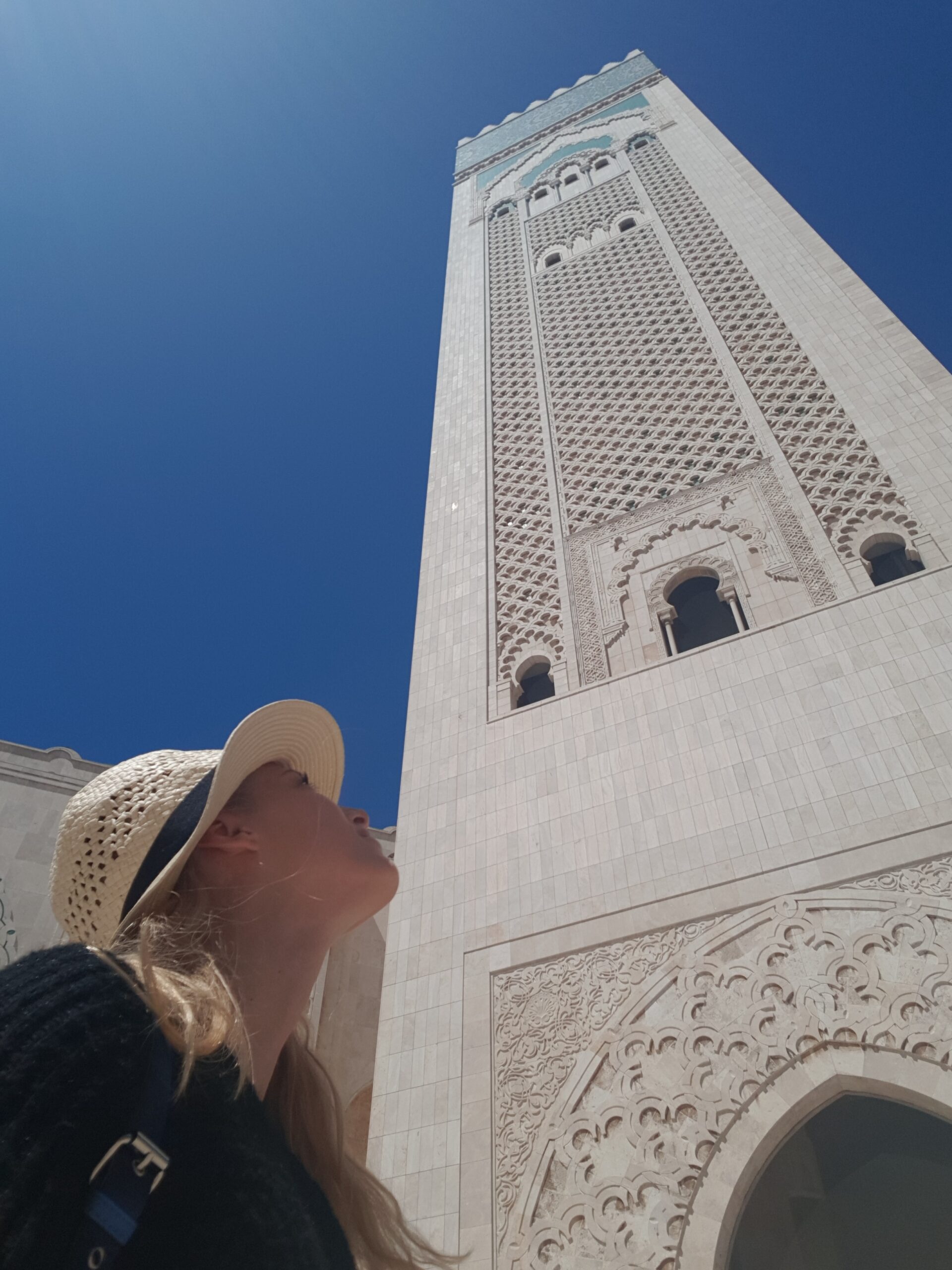 Μετά την Ραμπάτ πήραμε το τρένο και πήγαμε στην θρυλική και κοσμοπολίτικη Καζαμπλάνκα. Η Καζαμπλάνκα είναι πιο σύγχρονη και «ευρωπαϊκή» πόλη. Εκεί επισκεφθήκαμε το Μέγα Τζαμί του Χασάν Β’. Παρά την ζέστη που είχε χρειάστηκε να φοράω ζακέτα, ώστε οι ώμοι μου να είναι καλυμμένοι. Μιας και βρισκόμουν στο θρησκευτικό τους τόπο προσαρμόστηκα στους κανόνες τους, όπου οι γυναίκες πρέπει να είναι ντυμένες συντηρητικά και οι ώμοι να είναι καλυμμένοι.