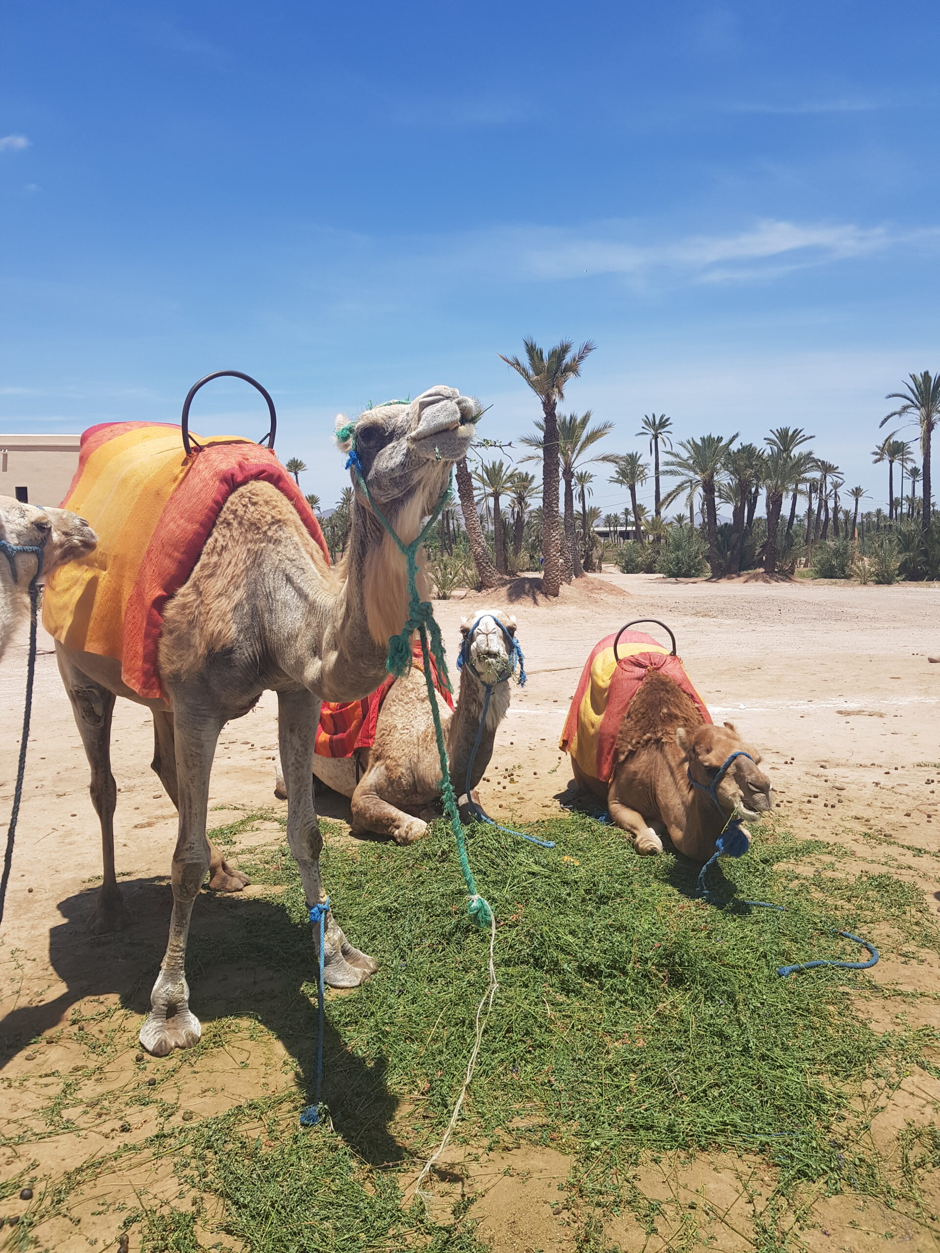 Ντόπιοι οργανώνουν εκδρομές με καμήλες είτε μέσα στην έρημο είτε σε πάρκα του Μαρακές. Προτιμήσαμε να πάμε εκδρομή εντός του πάρκου. Η διαδρομή διήρκεσε περίπου 45 λεπτά και πρόκειται για μια μοναδική εμπειρία.