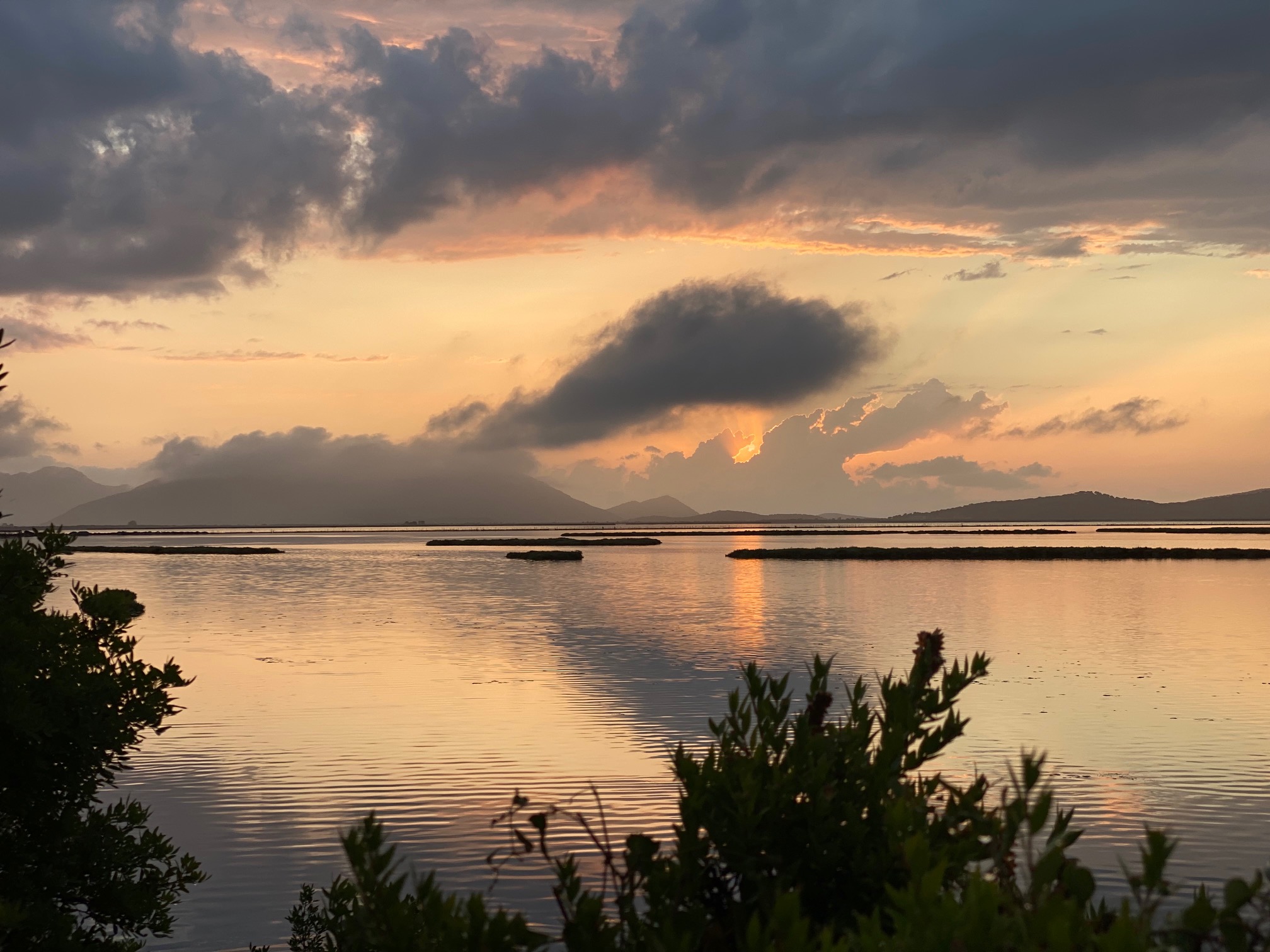 Καθώς ο ήλιος δύει στον ορίζοντα, ο ουρανός βάφεται με αποχρώσεις κόκκινου και πορτοκαλί που καθρεφτίζονται στα ήρεμα νερά της λιμνοθάλασσας. Οι παραδοσιακές πελάδες των ψαράδων στέκονται πάνω στο νερό σαν μικρά ξύλινα καταφύγια ζωής, ενώ οι μακριές βάρκες γλιστρούν αθόρυβα στα ρηχά. Τα φλαμίνγκο περπατούν στα νερά σαν ζωντανές πινελιές μέσα σε έναν πίνακα ζωγραφικής.