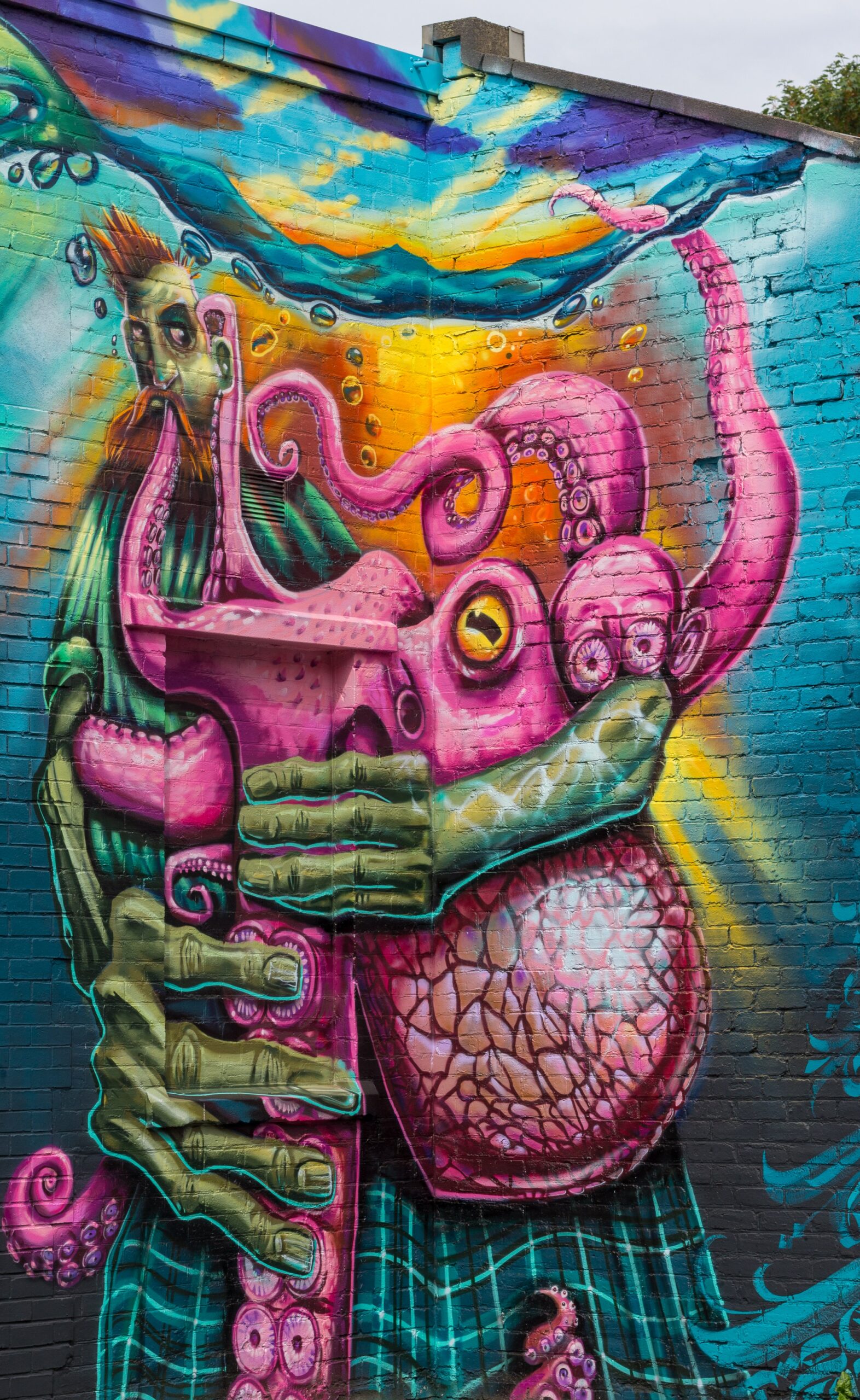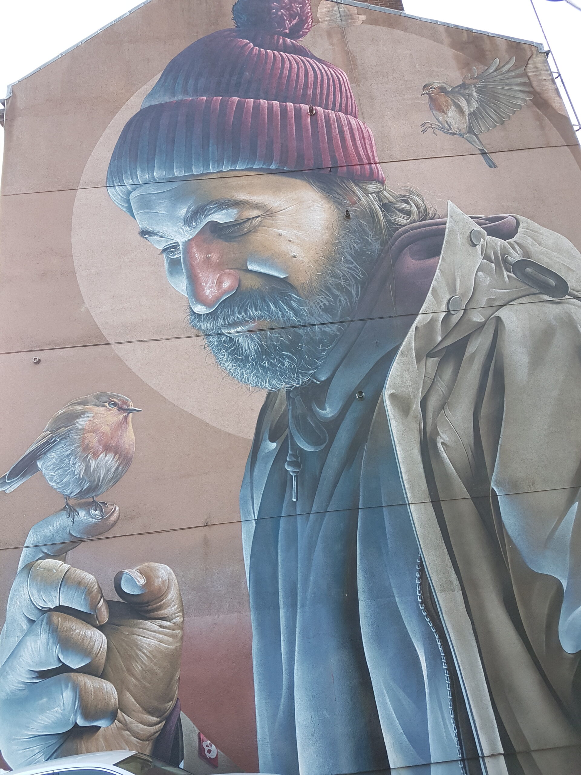 Κάτι άλλο που παρατήρησα τελευταία στην πόλη, είναι ότι εμφανίζονται πιο συχνά καινούργια murals ή όπως τα αποκαλούμε στην Ελλάδα γκράφιτι. Βολτάροντας στο κέντρο της πόλης, σε κάποια σημεία αν υψώσουμε το βλέμμα είτε θα αντικρύσουμε ένα μουσάτο άντρα με βαθυκόκκινο σκουφί να κοιτάζει στοργικά έναν κοκκινολαίμη που κάθεται στον δείκτη του χεριού του, είτε μια γιγάντια γυναίκα που μας εξετάζει μέσα από ένα μεγεθυντικό φακό. Μπορεί και έναν πεζό που κάνει νεύμα σε ένα ιπτάμενο ταξί που αιωρείται χάρις σε ένα «μπουκέτο» πολύχρωμα μπαλόνια.