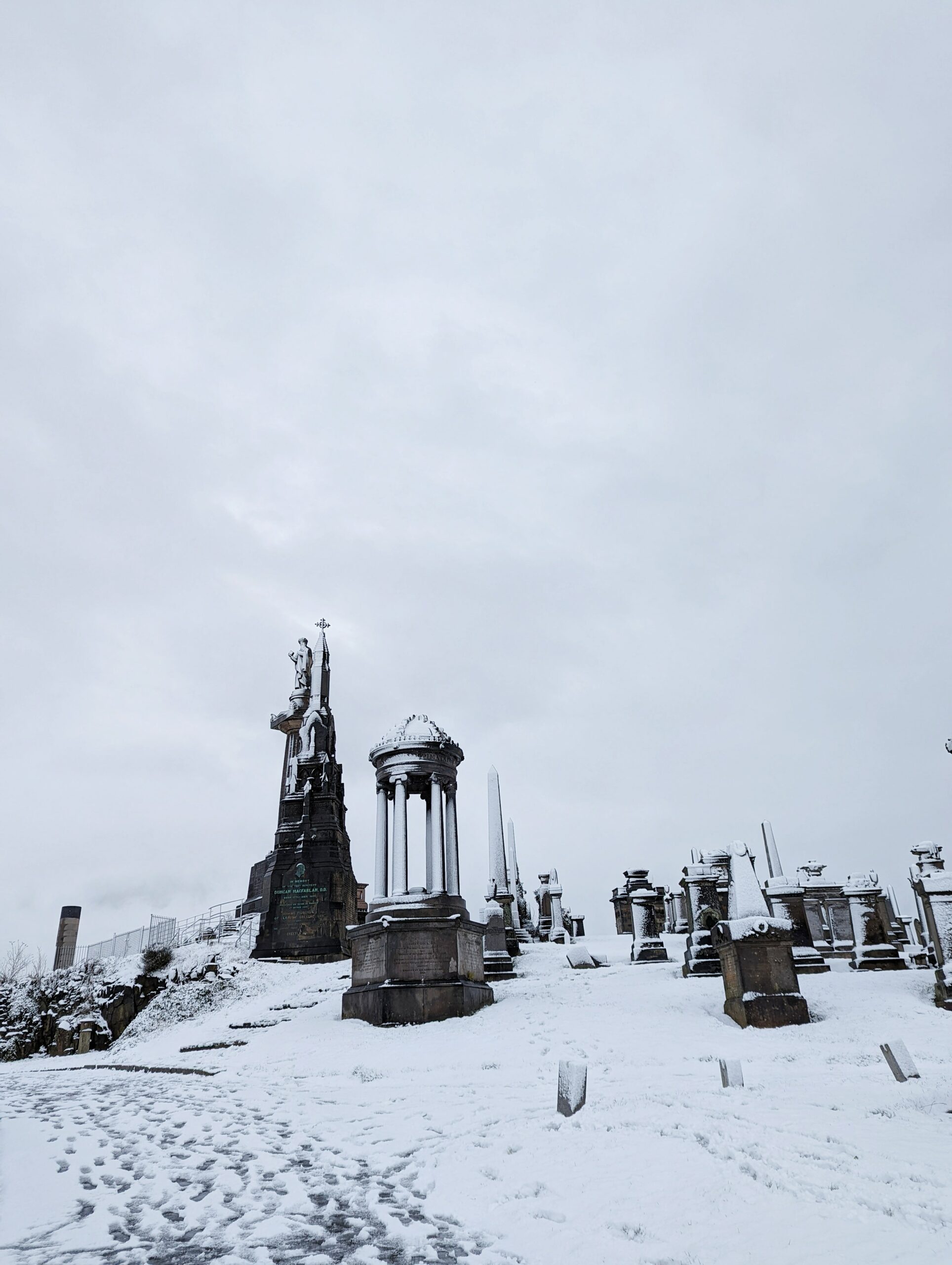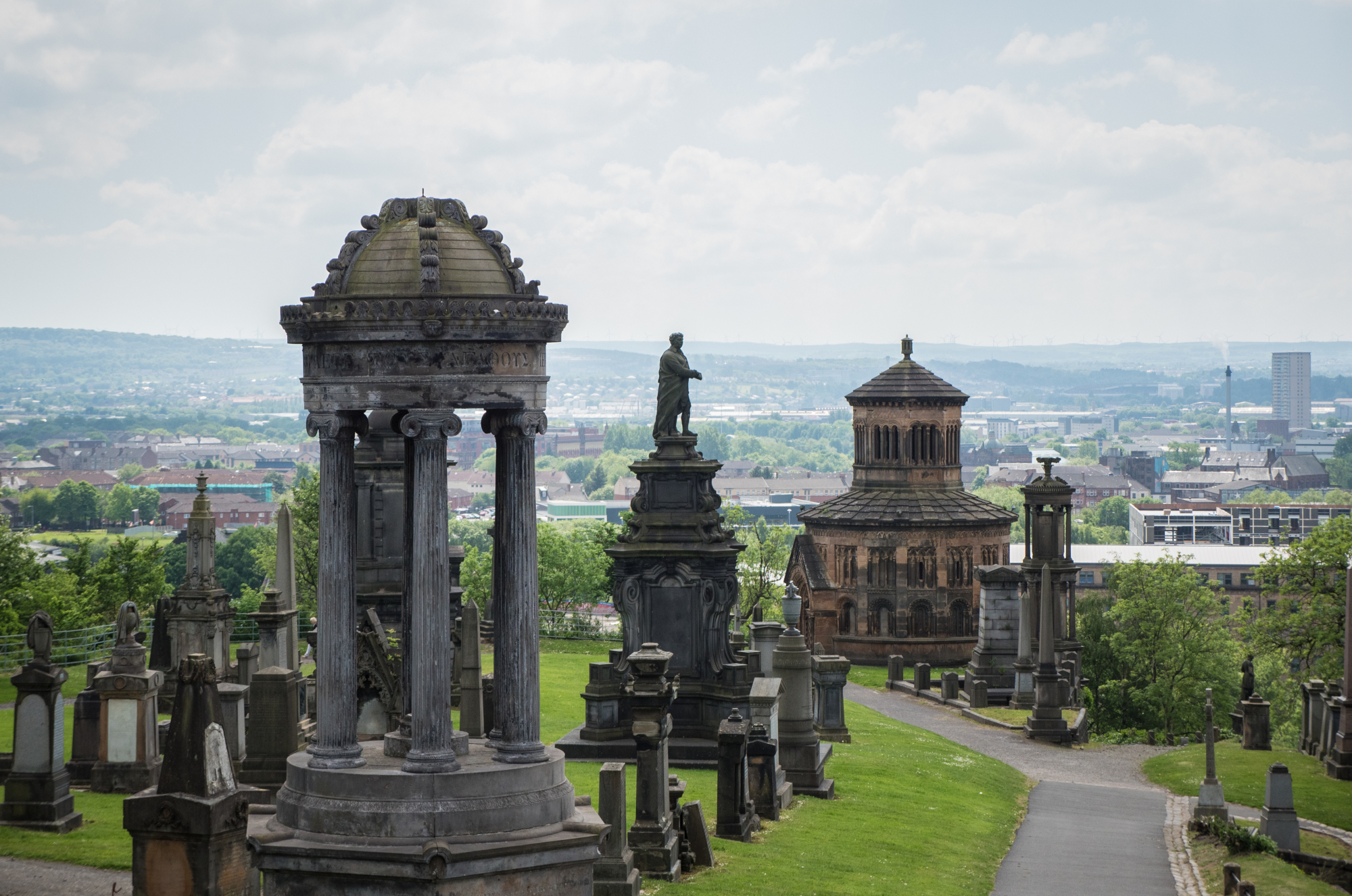 Η βόλτα που κατά την γνώμη πρέπει οπωσδήποτε να κάνει κάποιος, χωρίς να θέλω να τον αναγκάσω να φτύσει τον κόρφο του, είναι στην εμβληματική Necropolis με τους 50.000 μόνιμους «κατοίκους» της. Πρόκειται για ένα από τα σημαντικότερα αξιοθέατα της Γλασκώβης και ενδεχομένως της γηραιάς ηπείρου. Αυτός ο καταπράσινος λόφος με τα διάσπαρτα μνήματα και τις κρύπτες, εκπέμπει μια αλλόκοτη αίγλη, στα πρότυπα του νεκροταφείου-ορόσημου Père Lachaise του Παρισιού. Το ενδιαφέρον του να επισκεφτεί κάποιος τη Νεκρόπολη είναι η λογική του υπαίθριου μουσείου. Η αρχιτεκτονική των μνημάτων και μνημείων, εκτός από το ότι μας ταξιδεύει στην Βικτοριανή Γλασκώβη -τότε που ήταν η δεύτερη σημαντική πόλη της Βρετανική Αυτοκρατορίας- φέρει και τις υπογραφές μεταγενέστερων σπουδαίων για την εποχή τους Γλασκωβέζων αρχιτεκτόνων συμπεριλαμβανομένων των Alexander «Greek» Thomson (του δόθηκε το παρατσούκλι Greek γιατί λάτρευε την αρχαιοελληνική αρχιτεκτονική), Mackintosh και JT Rochead.