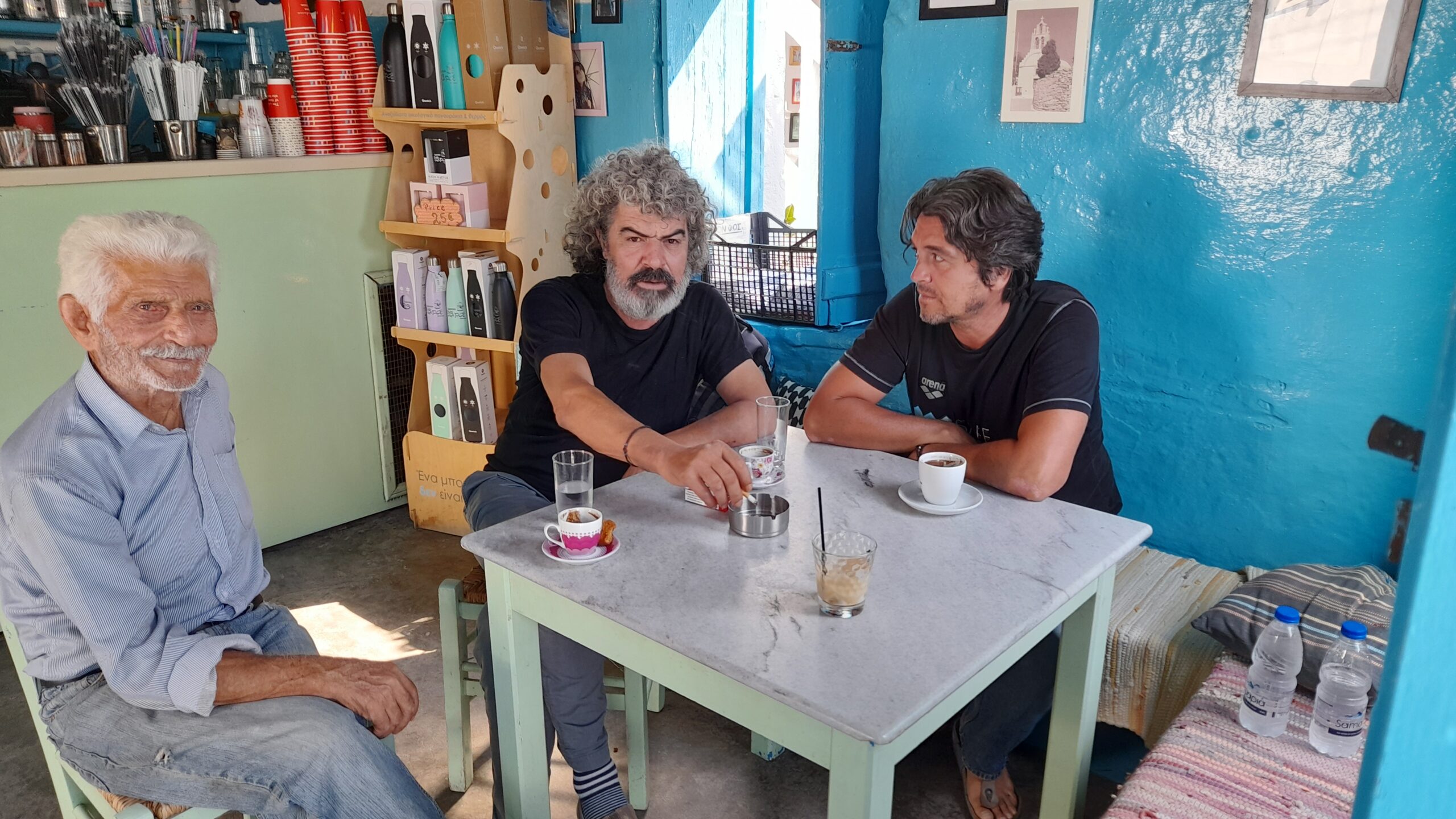 Το αμάξι του Μήτσου. Ένα αμάξι ελεύθερο από ταμπού και πρότυπα, δίχως αναγκαία παράθυρα και πόρτες, πασπαλισμένο με αφράτη άμμο. Οδηγός ο Θράσος, μας μεταφέρει κατευθείαν στη «Χαρά» στο ένα από τα δύο καφενεία-στέκια του νησιού. Κατά ένα περίεργο τρόπο, ήδη από την ώρα που κατεβήκαμε από το καράβι, οι ρυθμοί μας έπεσαν κατακόρυφα. Οι τύποι που συναντάμε γύρω μας λειτουργούν σε διαφορετικό σήμα ξεκάθαρα. Χαμογελούν συνεχώς και τα βλέπουν όλα αστεία. Υποπτευτήκαμε ότι πρέπει περνάνε πολύ καλά.